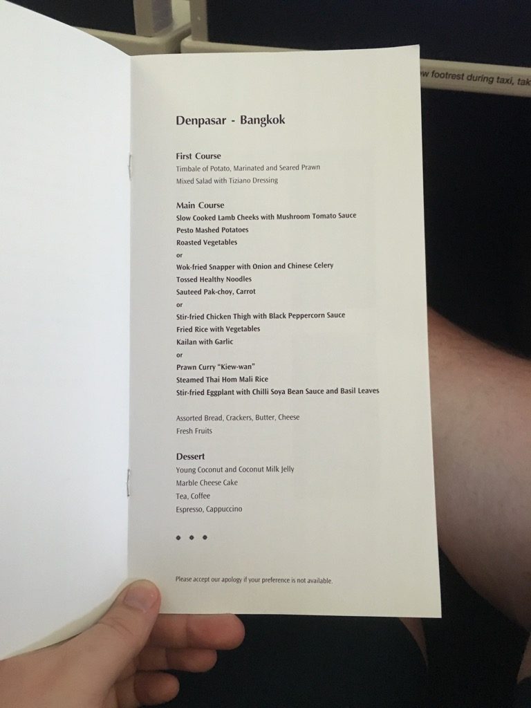 Auch vor dem Start wurden die Menükarten verteilt und schon die Wünsche für das Essen abgefragt. Obwohl wir noch beim Check In unterschreiben mussten, dass wir auch ohne Essen fliegen würden, hatte Thai natürlich auch für uns ein Essen geladen.