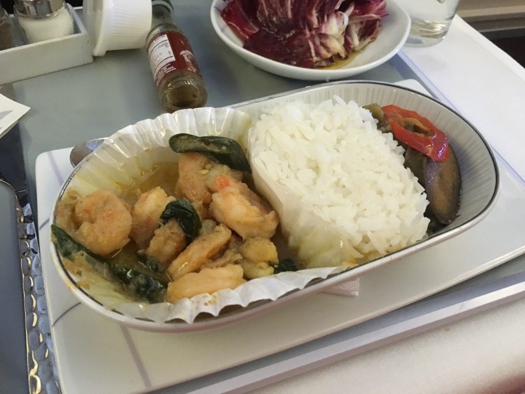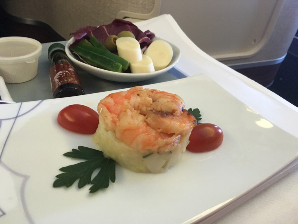 Die Garnelen als Vorspeise waren gut. Der Salat allerdings ein wenig eigen. Besonders der abgepackte Käse erinnerte allerdings mehr an die Economy Class, als an eine Business Class. Highlight der Vorspeise war allerdings das warme Knoblauchbaguette.