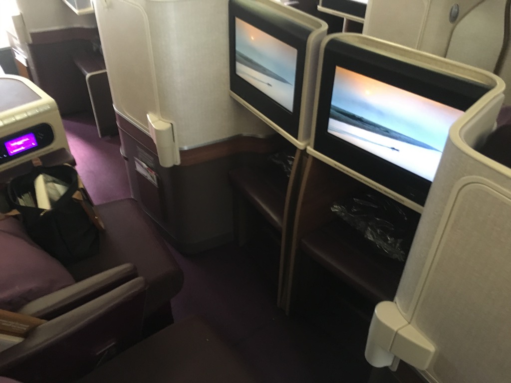 Die Thai Business Class in der Boeing 777-300 entspricht im großen und ganzen der, welche auch im Airbus A350 verbaut ist. Die 42 Sitze sind in einer versetzten 1-2-1 Anordnung in zwei Kabinen verbaut. In unserem Fall wurde nur die vordere Kabine besetzt. Die zweite Business Class Kabine blieb leer.