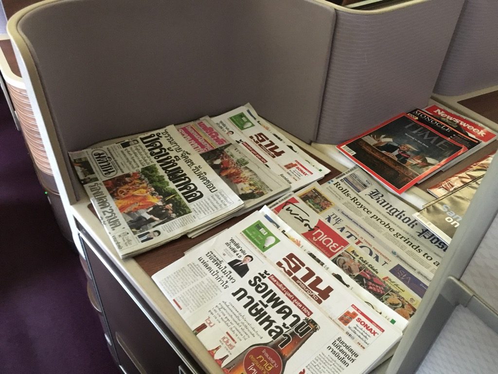 Beim Einsteigen an 1L wurden wir freundlich, mit der Thai üblichen Verbeugung begrüßt und der Weg zu den Sitzen wurde uns nach einem Blick auf die Bordkarte gewiesen. Vor der ersten Reihe lagen Tageszeitungen und Magazine bereit, welche nach dem Boarding den Passagieren auch noch am Platz angeboten wurden. Mit einem TIME Magazin und einer Newsweek war ich den Flug über dann auch gut beschäftig.