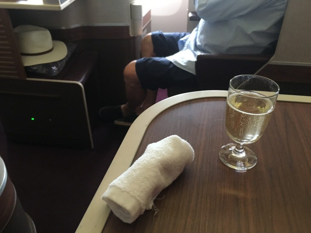 Kaum hatten wir uns hingesetzt und unser Handgepäck verstaut, wurden uns auch schon heiße Tücher und ein Getränk angeboten. Eigentlich standen zur Auswahl Champagner, stilles Wasser und Orangensaft. Auf Nicoles Nachfrage war auch Wasser mit Kohlensäure kein Problem vor dem Start. Generell war die Crew auf diesem Flug extrem aufmerksam und herzlich. Etwas, dass ich auf dem Hinflug nach Bali doch ein wenig vermisst habe.