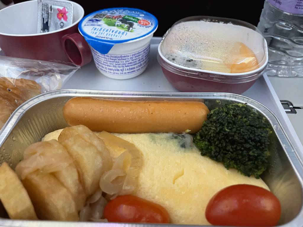 Okay, wir waren auf dem Weg in die exklusivste Lounge von Singapore Airlines. Vor dem Private Room als billigen Economy-Fraß zu vertilgen, das klang mir nicht logisch. Dennoch möchte ich anerkennen, was Thai Airways hier auf gut zwei Stunden auftischt. Das ist ein vollständiges warmes Frühstück.