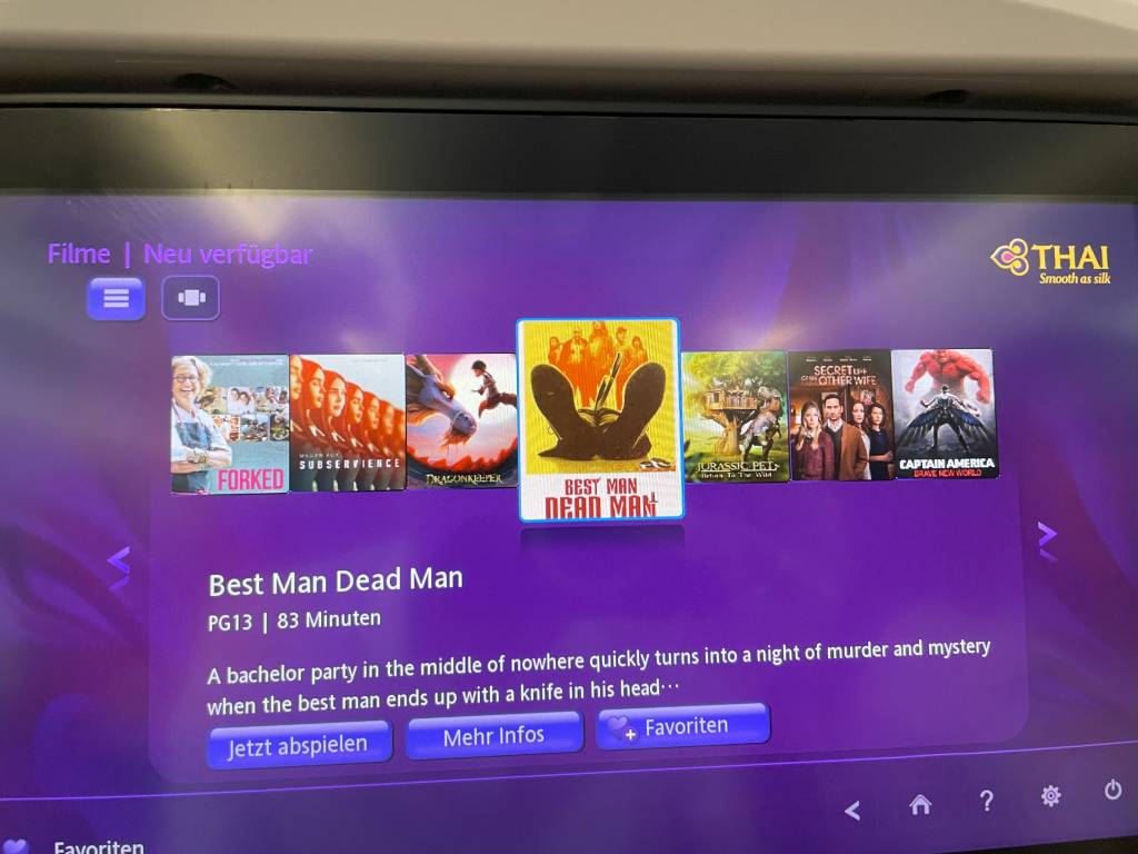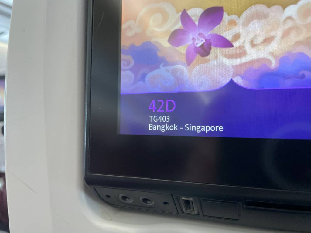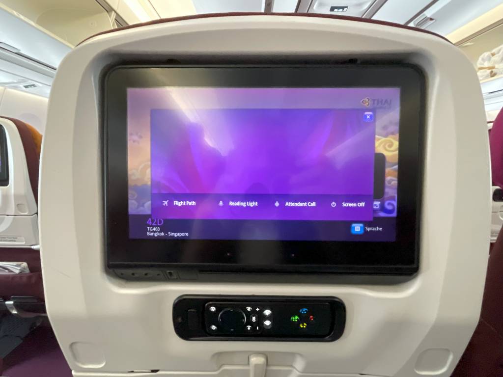 Bei einer Flugzeit von zwei Stunden und 15 Minuten braucht eigentlich niemand ein Inflight-Entertainment (IFE). Da zwischen Bangkok und Singapur aber nun einmal ein Airbus A350 fliegt, ist es halt da. Und bietet die volle Auswahl an Unterhaltungsprogrammen bestehend aus aktuellen, wie klassischen Filmen, Musik und Spielen.