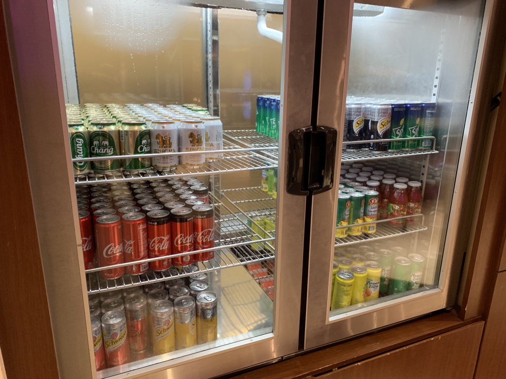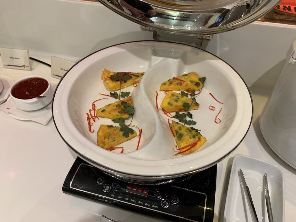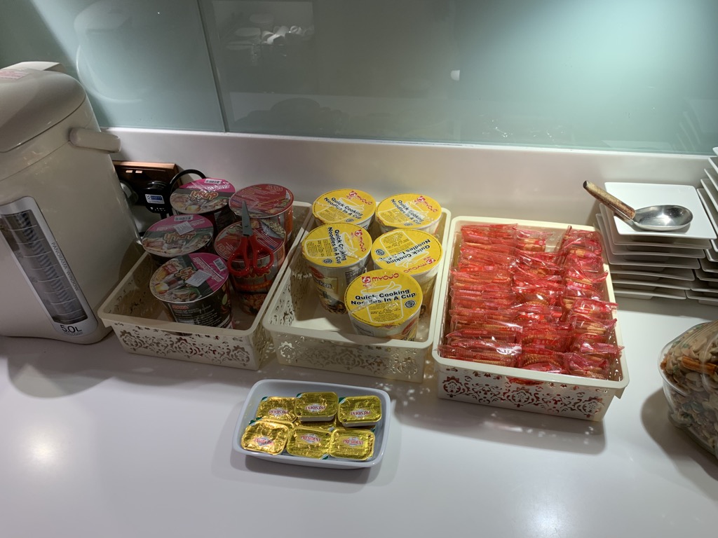 Neben einem nicht besonders gut aussehenden Omelette (am Abend) und Thai Curry mit Reis gab es noch einen Wärmeschrank mit Frühlingsrollen, Croissant und Saté-Spießen, sowie abgepackte Sandwiches und instant Nudelsuppen.