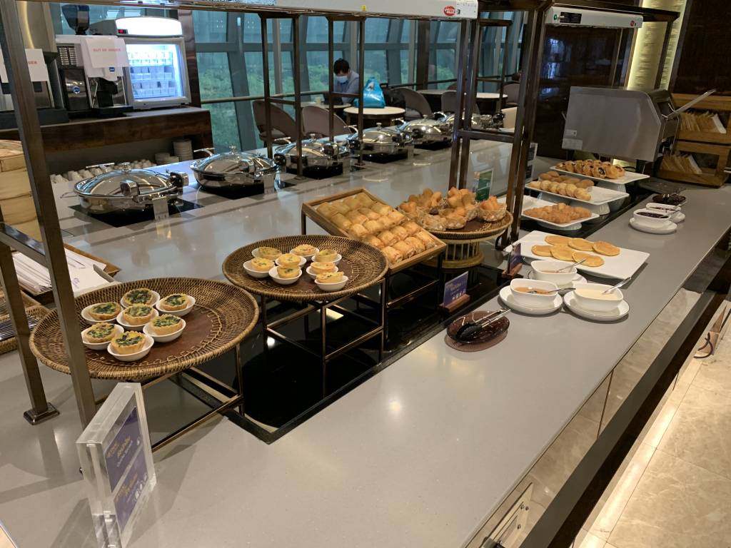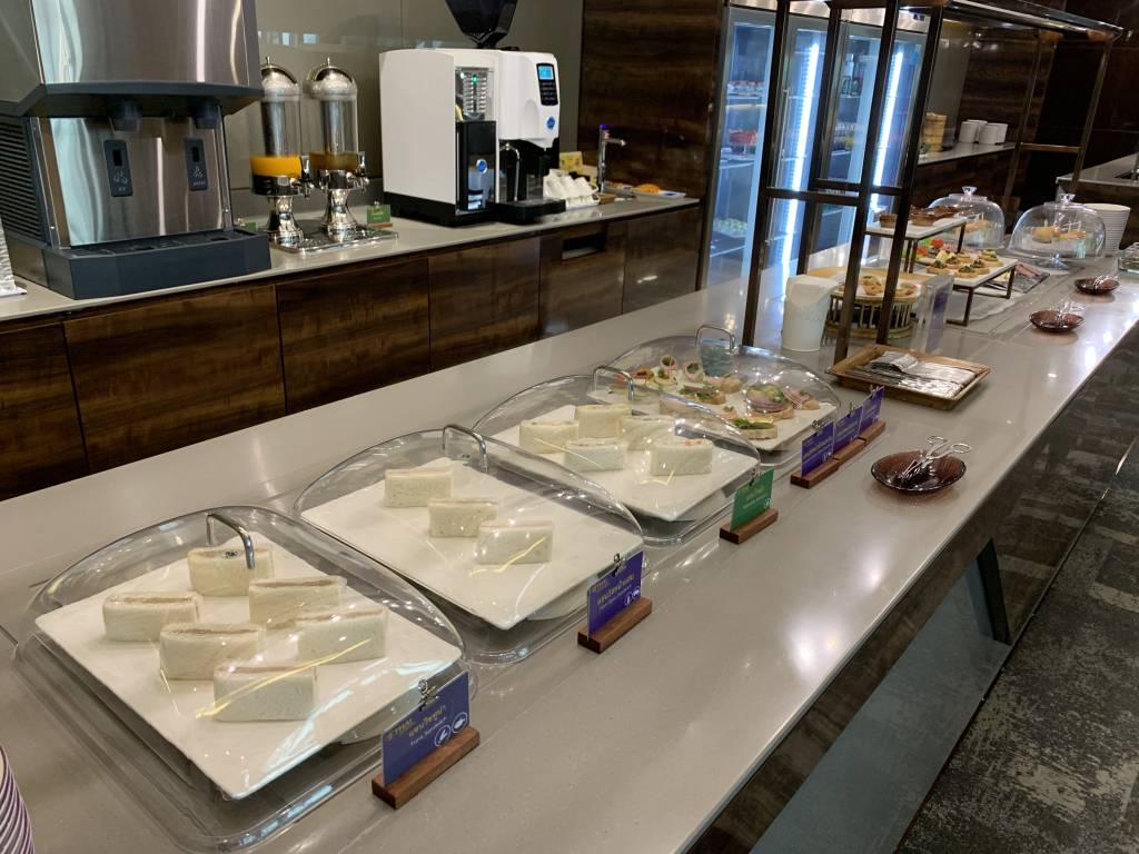 Die Frühstücks-Auswahl im linken Bereich der Lounge war mit Sandwiches, belegten Broten, Croissants, Quiche, Kuchen und warmen Gerichten schon mehr als ausreichend. Trotzdem nahm es sich das aufmerksame Personal nicht, mich noch auf die weit größere Auswahl im rechten Bereich der Lounge hinzuweisen.