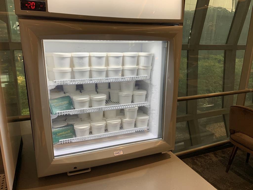 Dort steht ergänzend eine Live-Cooking-Station und ein umfangreiches Salat-Büffet zur Verfügung. Alle anderen Standards aus dem anderen Teil der Lounge gab es natürlich auch hier. Plus weitere warme Gerichte. Und großartig selbst zum Frühstück: Kokosnuss und Thai Tea Eiscreme.