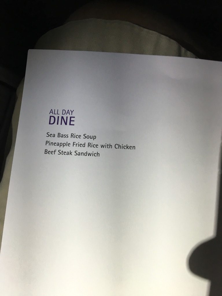 Thai bietet in der Business Class keine zweite Mahlzeit vor der Landung an, allerdings kann man sich den gesamten Flug über verschiedene kleinere Gerichte von einer „All- Day Dinning“ Karte bestellen. Direkt nachdem ich aufgewacht bin, wurde ich gefragt, ob ich noch etwas von diesem Menü essen möchte, allerdings hatte ich keinen Hunger, sodass ich nur noch etwas vor der Landung in Bangkok getrunken habe.