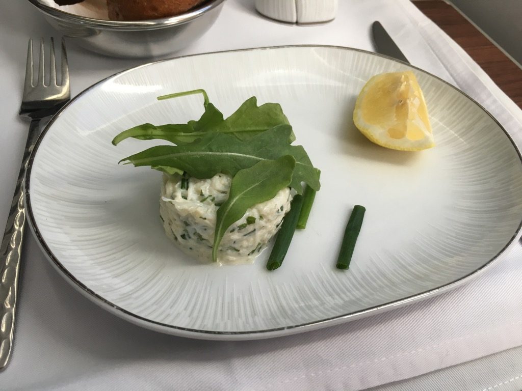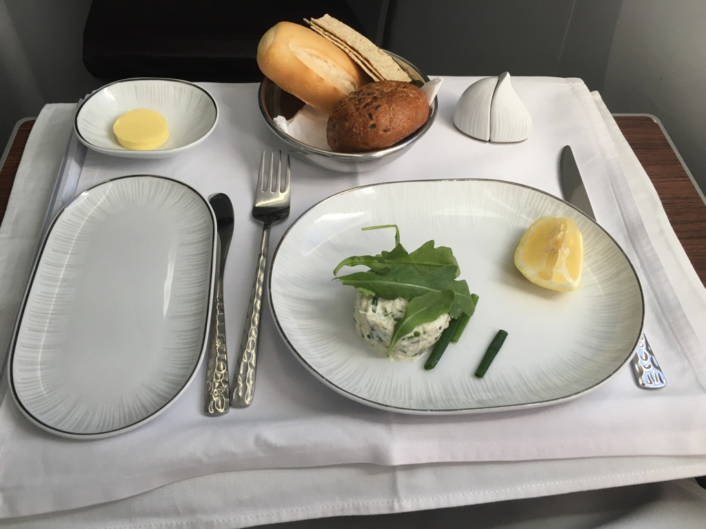 Ich habe mich für das westliche Menü entscheiden. Die Vorspeise wurde zusammen mit einem Brotkorb auf einem Tablett serviert. Die Aufdeckung in der Thai Business Class finde ich übrigens wirklich schön, allerdings fand ich es schade, dass alles auf einem Tablet serviert wurde und der Tisch nicht eingedeckt wurde.
