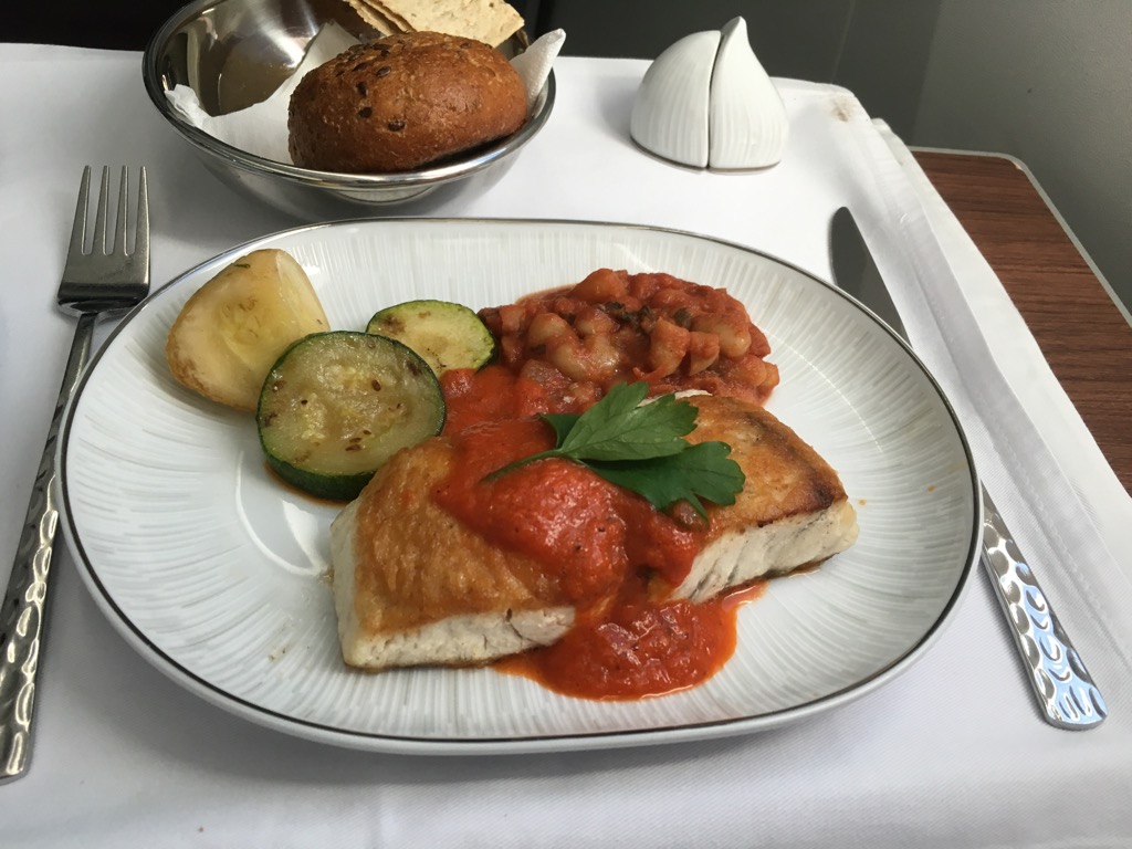 Als Hauptgang wurde mir kurz nachdem ich mit meiner Vorspeise fertig war, der Fisch serviert. Die Beilage aus Gemüse und weißen Bohnen war ein wenig ungewöhnlich, aber durchaus sehr lecker.