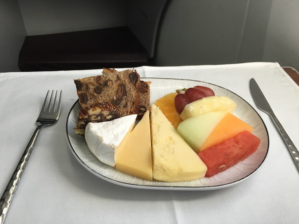 Direkt als mein Hauptgang abgeräumt wurde, wurde mir auch ungefragt ein Teller mit Käse und Früchten serviert. Der Käse und die Früchte waren gut, wenn auch die Portion die größte war, welche mir jemals als Käsegang in einem Flugzeug serviert wurde. Der Teller war von seiner Größe her identisch mit dem des Hauptgangs und voll mit Käse, Früchtebrot und Obst, sodass ich diesen Gang leider bei weitem nicht komplett essen konnte, was die Flugbegleiterin zu einem sehr unglücklichen Gesichtsausdruck bewegt hat.