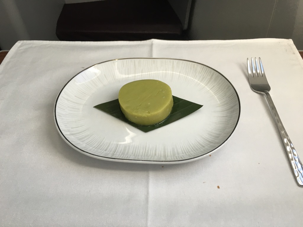 Nachdem ich auf die Frage nach einem Dessert das Thai Dessert bestellte, strahlte man mich wieder an und servierte mir den Kokos- Kürbis Pudding. Auch wenn er mich nicht überwältigt hat, war dieses Dessert wenigstens nicht so unfassbar süß wie viele Desserts, welche im Flugzeug serviert werden.