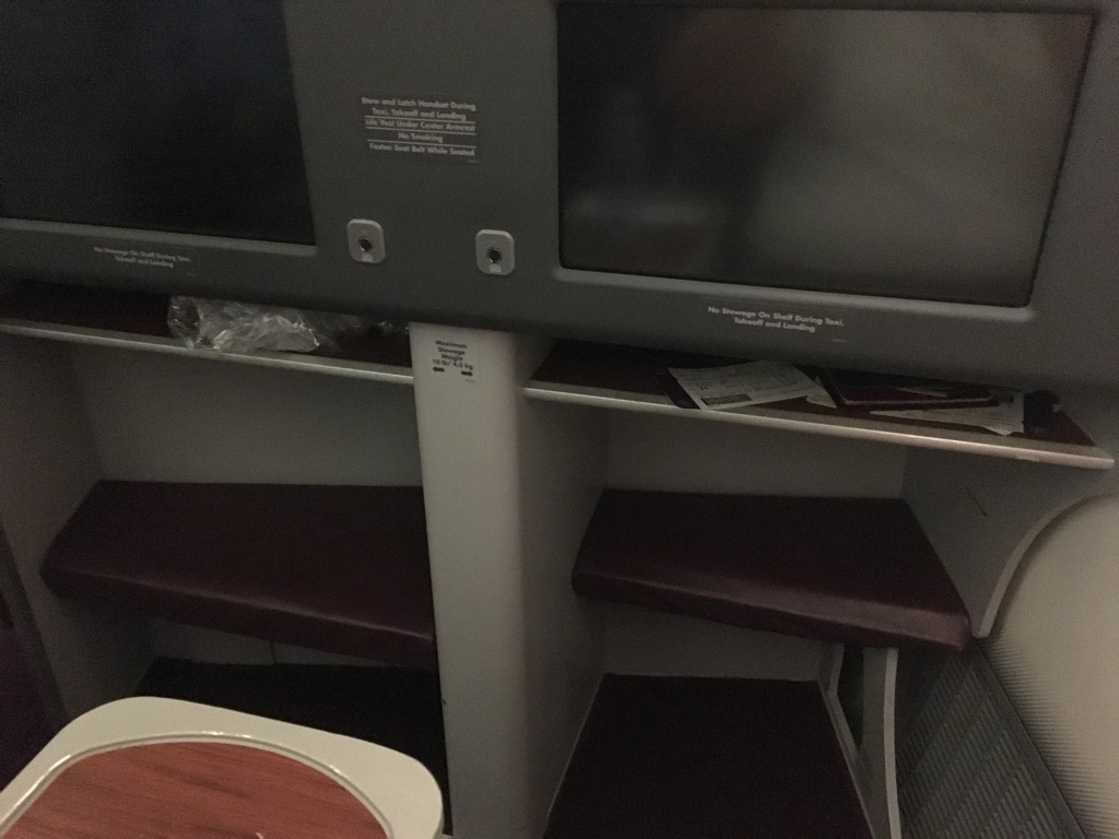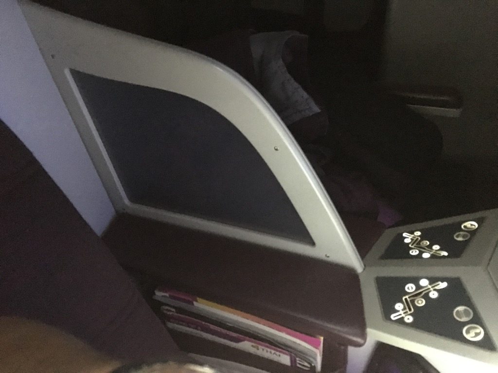 Grundsätzlich ist der Thai Business Class Sitz in der Boeing 787 mit dem von United Airlines, KLM und auch Lufthansa technisch identisch. Allerdings unterscheidet er sich natürlich im Detail. Ich habe mich bewusst für Reihe 1 entschieden, da diese Sitze einen deutlich größeren Fußraum bieten, als die anderen Sitze in der Kabine. Über dem Fußraum befindet sich neben einer Ablage auch der recht große Fernseher des In Flight Entertainments.