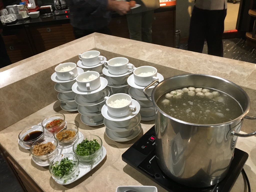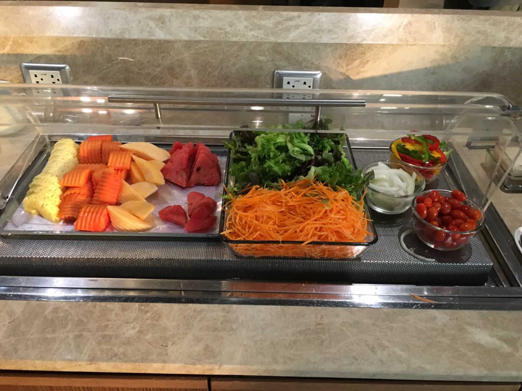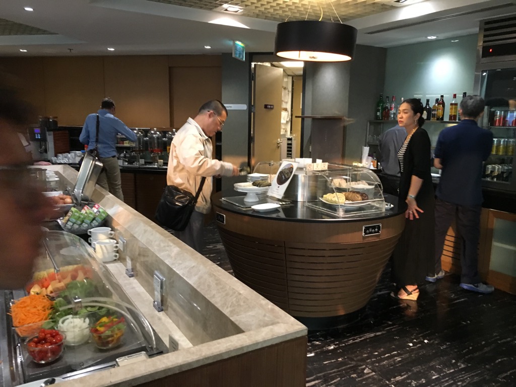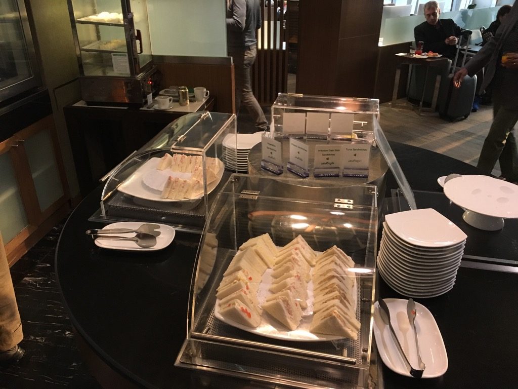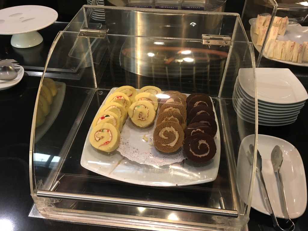 An einem Buffet in der Lounge wurde eine recht große Auswahl an Speisen angeboten. Neben Salaten, Sandwiches und Kuchen, gab es auch einige warme Speisen, wie Eier, Würstchen und Schinken, Quiche, Frühligsrollen und gefüllte asiatische Teigtaschen.