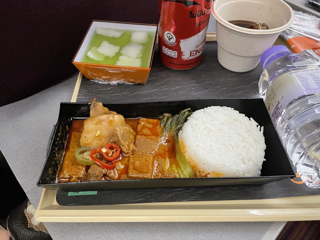 Direkt nach dem Start wurde dann auch das Essen serviert. Hier wurde uns leider auch mitgeteilt, dass es nur noch ein Pad Thai gibt und daher haben wir dann als zweites Essen das Thai Chicken Curry bekommen.