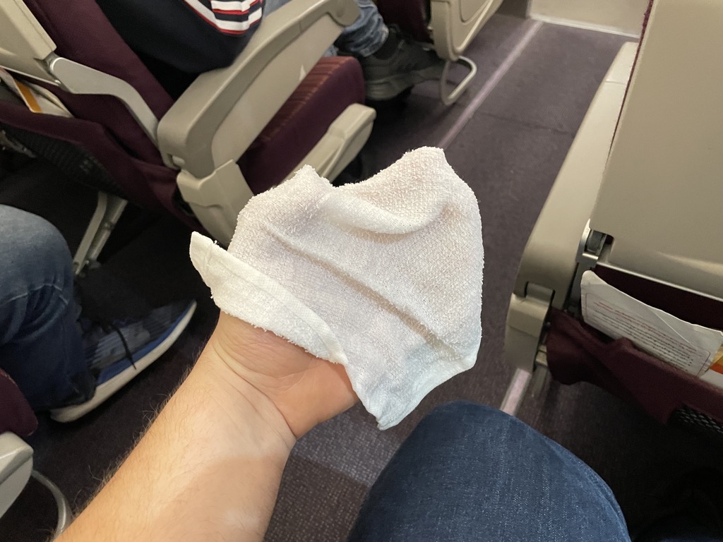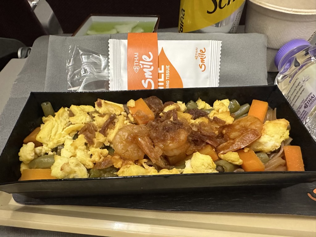 Auf einen Welcome Drink am Boden verzichtet man bei Thai Smile, allerdings gibt es noch vor dem Start ein warmes Tuch. Dazu hat die Flugbegleiterin die Essenswünsche abgefragt und es gab zwei Hauptgerichte zur Auswahl, ein Pad Thai mit Garnelen und ein Thai Curry.