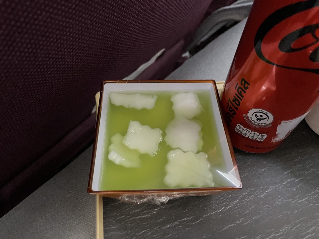 Bei der Präsentation der Essen hatte man dann doch eher den Eindruck man sei in der Economy Class mit den vielen Einweg Bestandteilen. Allerdings war vor allem das warme Essen und auch das Dessert absolut in Ordnung und hätte so auch in der Thai Business Class auf diesem Flug serviert werden können, um nicht zu sagen, wir haben hier schon sehr viel schlechteres im Flugzeug bekommen.
