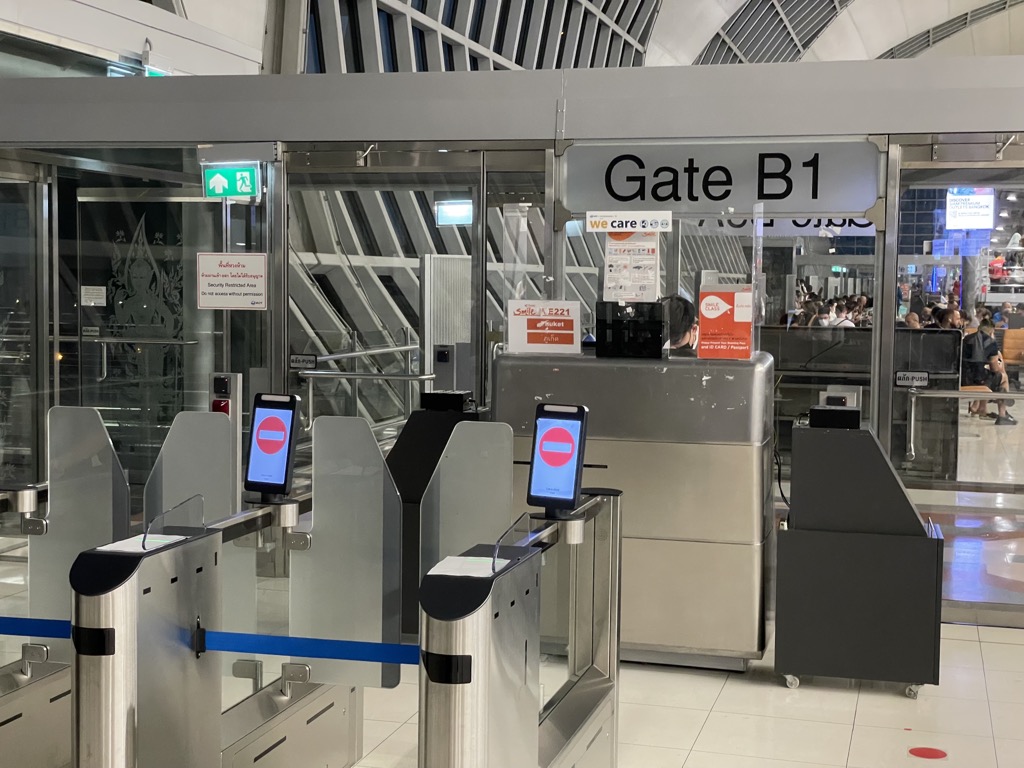 Da die Lounge im Domestic Terminal in Bangkok vor der Sicherheitskontrolle liegt, haben wir uns pünktlich vor der Boarding Zeit auf den Weg zum Gate gemacht. An der Sicherheitskontrolle war man erstaunlich unfreundlich für das Land des Lächelns und vor allem dass man ein Kind auf dem Arm hatte, hat die Damen und Herren absolut nicht gekümmert.