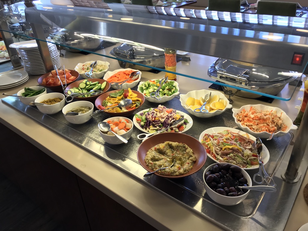Beim Abendessen war das Buffet ähnlich aufgebaut. Hier gab es zusätzlich noch viele leckere verschiedene Salate, verschiedene Kuchen und Nachspeisen und täglich wechselnde warme Speisen. Auch hier war wieder alles Angebotene frisch und geschmacklich gut. Bei allen Mahlzeiten war das Personal freundlich und hat zügig die Tische abgeräumt oder das Buffet aufgefüllt.