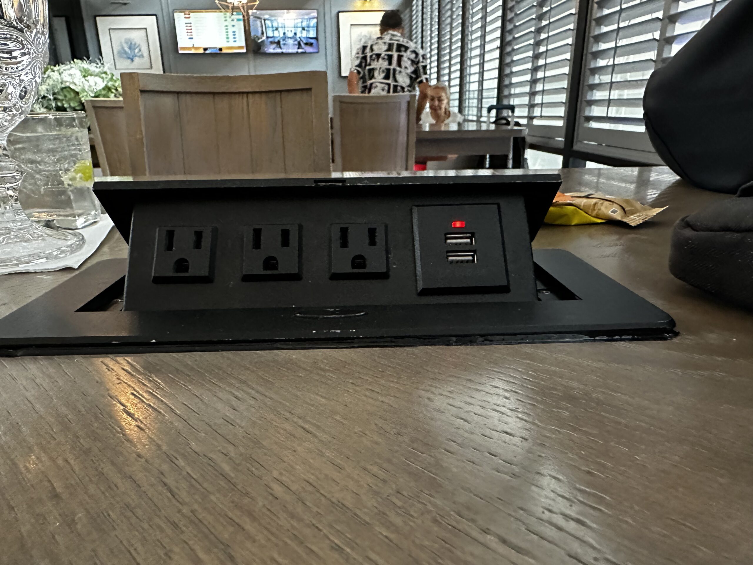 Steckdosen sind in den Tischen oder im Boden installiert, das Internet war zuverlässig.