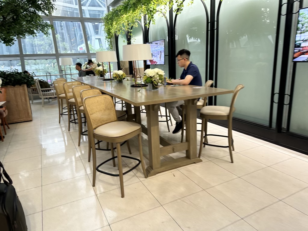 Mit schnellem Wifi konnte man entweder an Sitzgruppen Platz nehmen und essen, oder an einem langen Hochtisch arbeiten. Ich fand die Gestaltung, obwohl alles recht eng war, sehr angenehm, weil es nicht alles in einem Stil gehalten war und somit wie ein kleiner Marktplatz wirkte. Eigene Duschen hat die Lounge nicht, zumindest haben wir keine gefunden.