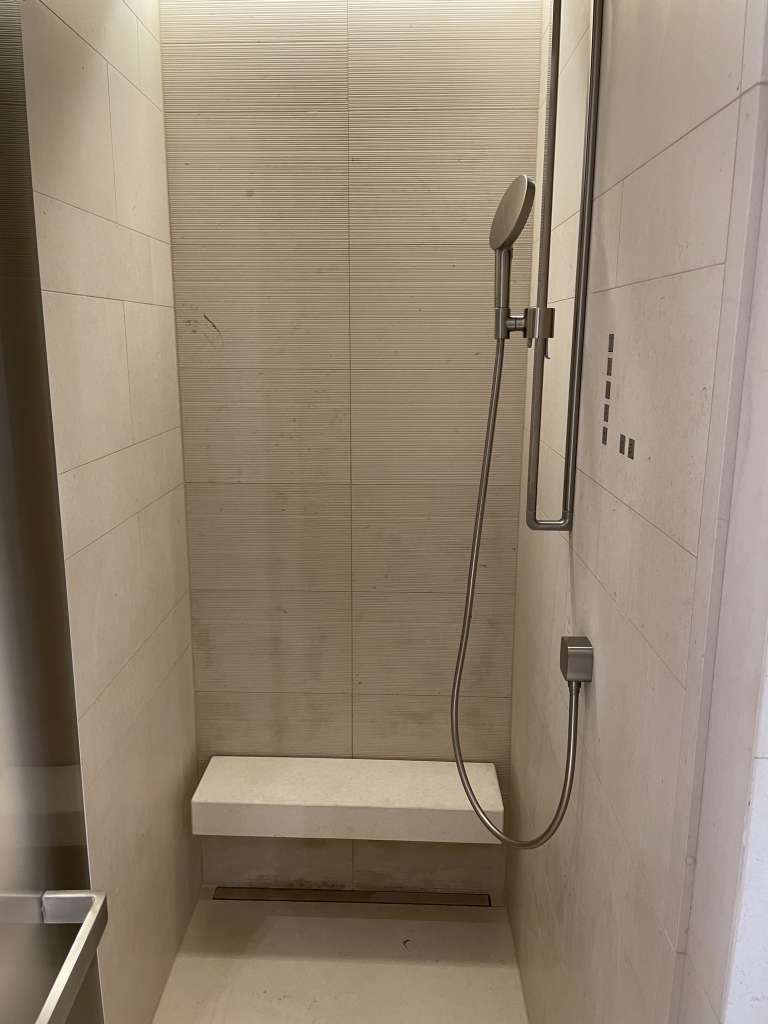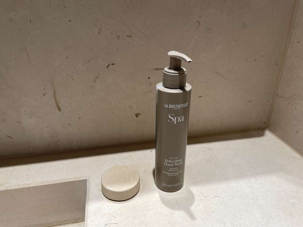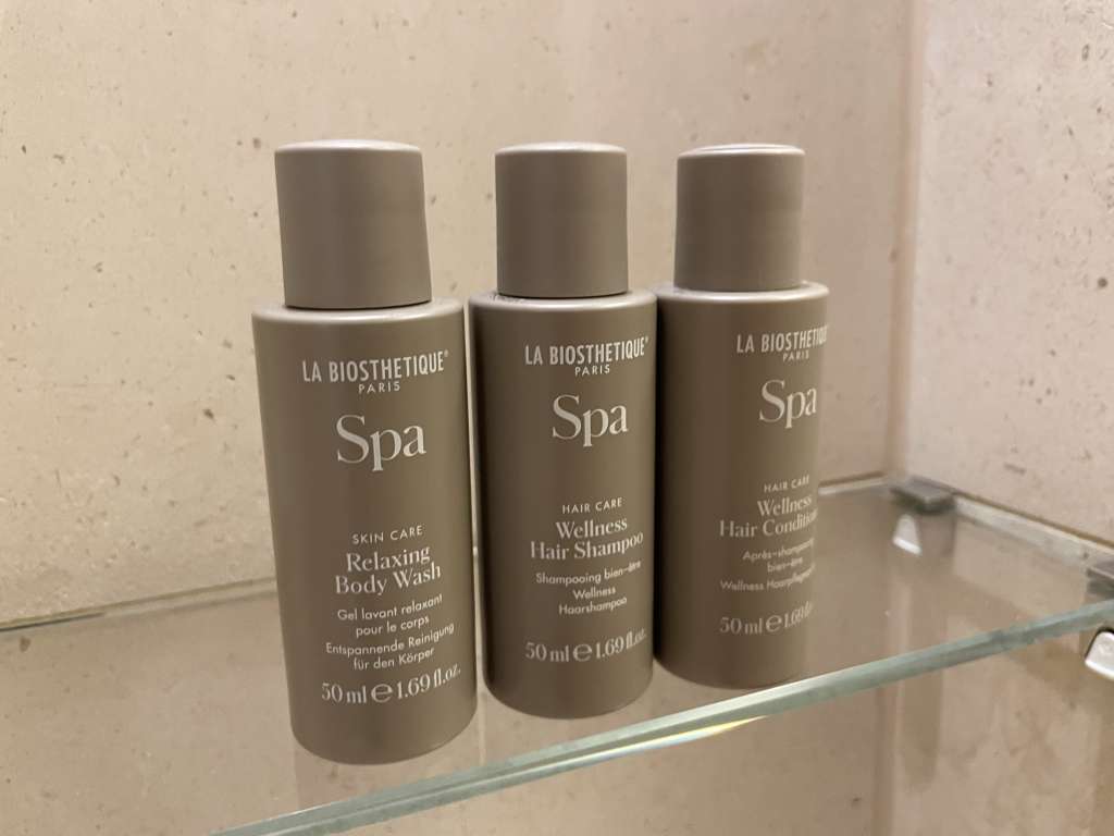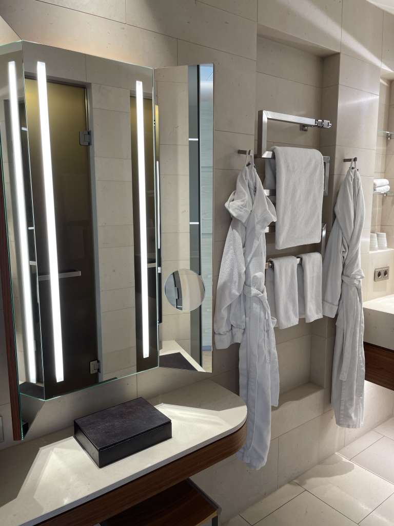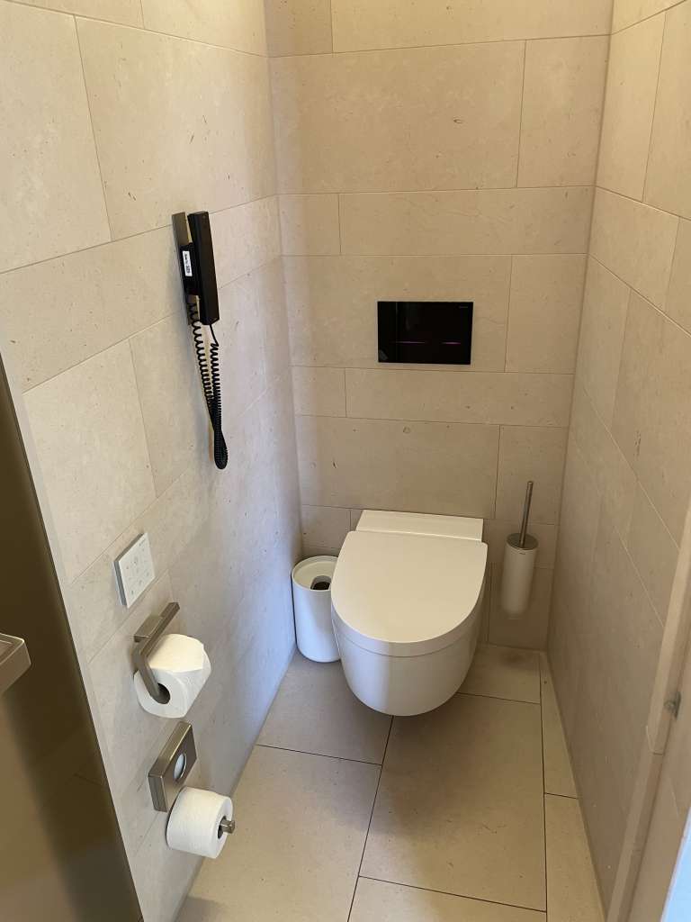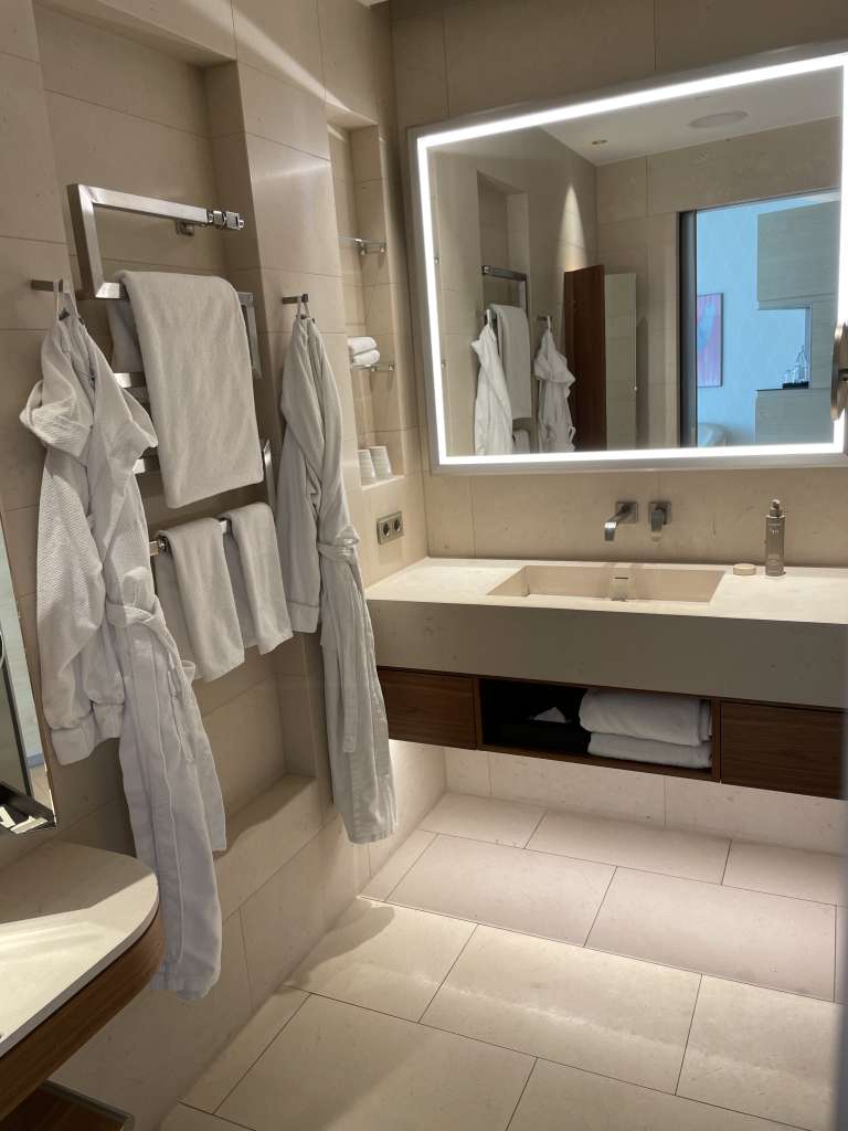 Das Badezimmer im Fontenay Deluxe Room ist mit Marmor verkleidet und verfügt über eine großzügige, begehbare Dusche. Das japanische WC rechtfertigte in meiner persönlichen Bewertung das Superior hinter den fünf Sternen. Ein Waschbecken mit stilvollen Armaturen und ein großerm, beleuchteten Spiegel rundete die Ausstattung ab. Hochwertige Pflegeprodukte, Handtücher und Bademäntel standen mir ebenfalls zur Verfügung. Und während die meisten Hotels mittlerweise Pflegeprodukte aus dem Spender bieten, gibt es hier noch diese großartigen kleinen Fläschchen mit Duschbad, Shampoo und Conditioner.