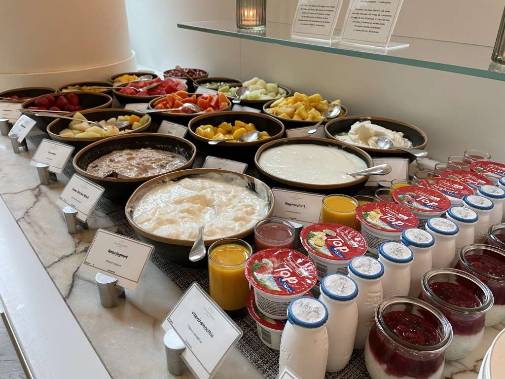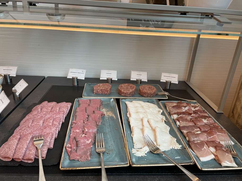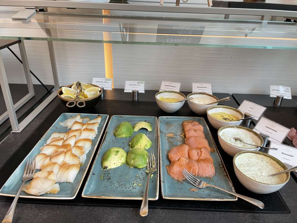 Und während ich auf mein Omelette wartete, stürzte ich mich abenteuerlich auf das Büfett. Das alle angebotenen Wurst- und Käseaufschnitte von deutlich höherer Qualität als im nächsten Holiday Inn waren, dürfte klar sein. Aber auf die Details kam es eigentlich an, denn so konnte ich mir frische Salate zusammenstellen und zum Fisch die passenden Ergänzungen wählen. Auch ein Gläschen Sekt, was in dem Fall ein französischer Schaumwein war, war jederzeit griffbereit.