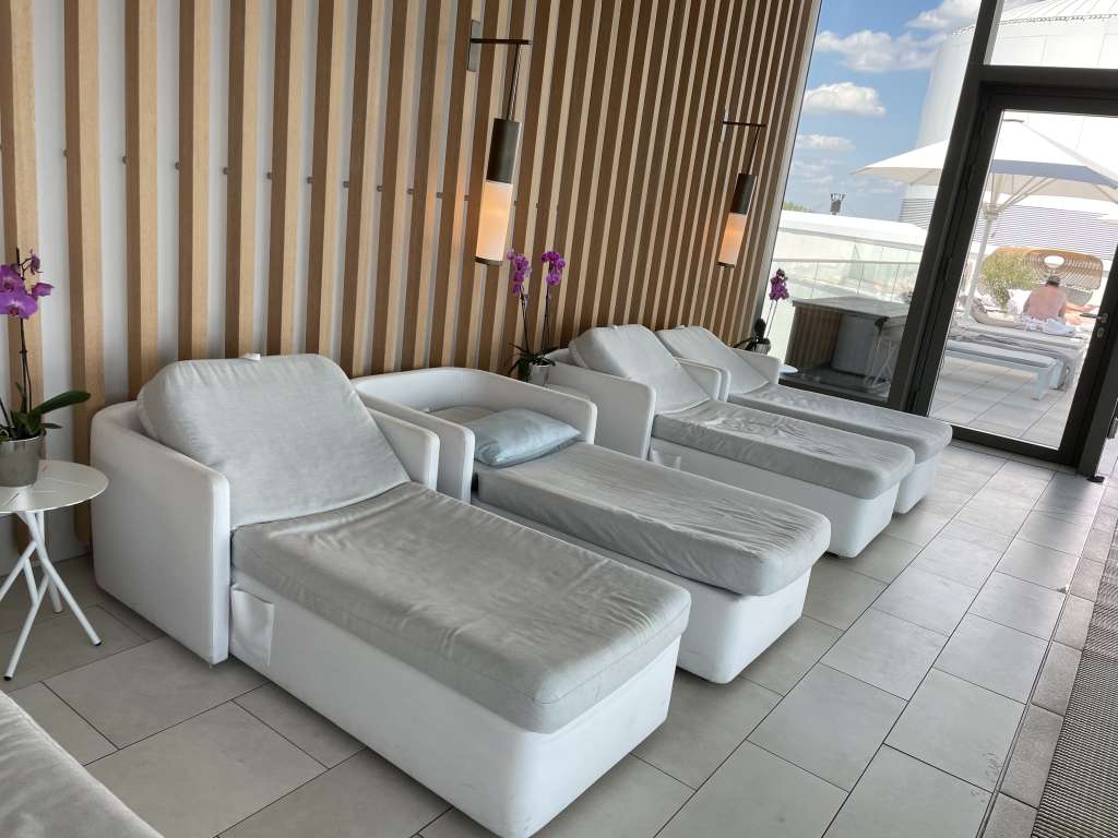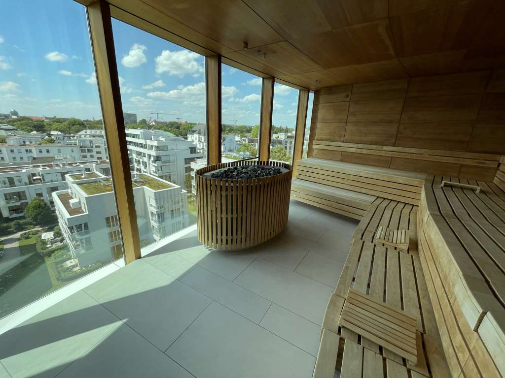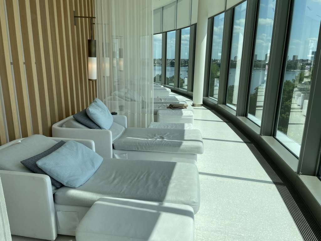 In den Pool habe ich es jedoch nicht ein einziges Mal geschafft. Stattdessen nahm ich immer wieder die Abzweigung Richtung Spa mit seinen zahlreichen Liegen und der traumhaften Aussicht über das Zentrum Hamburgs. Unterbrochen habe ich die Entspannungsphasen mit regelmäßigen Einheiten in der finnischen Sauna. Dort wird zu jeder vollen Stunde automatisiert ein Aufguss durchgeführt. Wer es lieber feucht mag, weicht auf das Dampfbad aus und gönnt sich anschließend eine erfrischende Dusche.