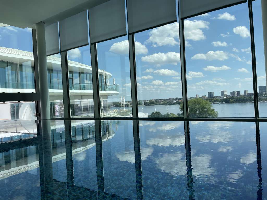 Im verregnete Hamburg ein Hotel mit Außenpool? Kann man natürlich machen und hat damit sicher auch ein besonderes Verkaufsargument. Ziemlich geschickt gelöst im The Fontenay: Ihr könnt in den Innenpool springen und Eure Bahnen bis in den Außenbereich ziehen. Eine automatische Schiebetür im Pool eröffnet Euch die Möglichkeit. Liegen gibt es sowohl im Inneren als auch im Außenbereich. Und als ich am Samstag bei strahlendem Sonnenschein vor Ort war, wurde besonders die Outdoor-Variante stark frequentiert. Und dennoch war der Ausweichbereich ein paar Stufen tiefer abgekordelt.