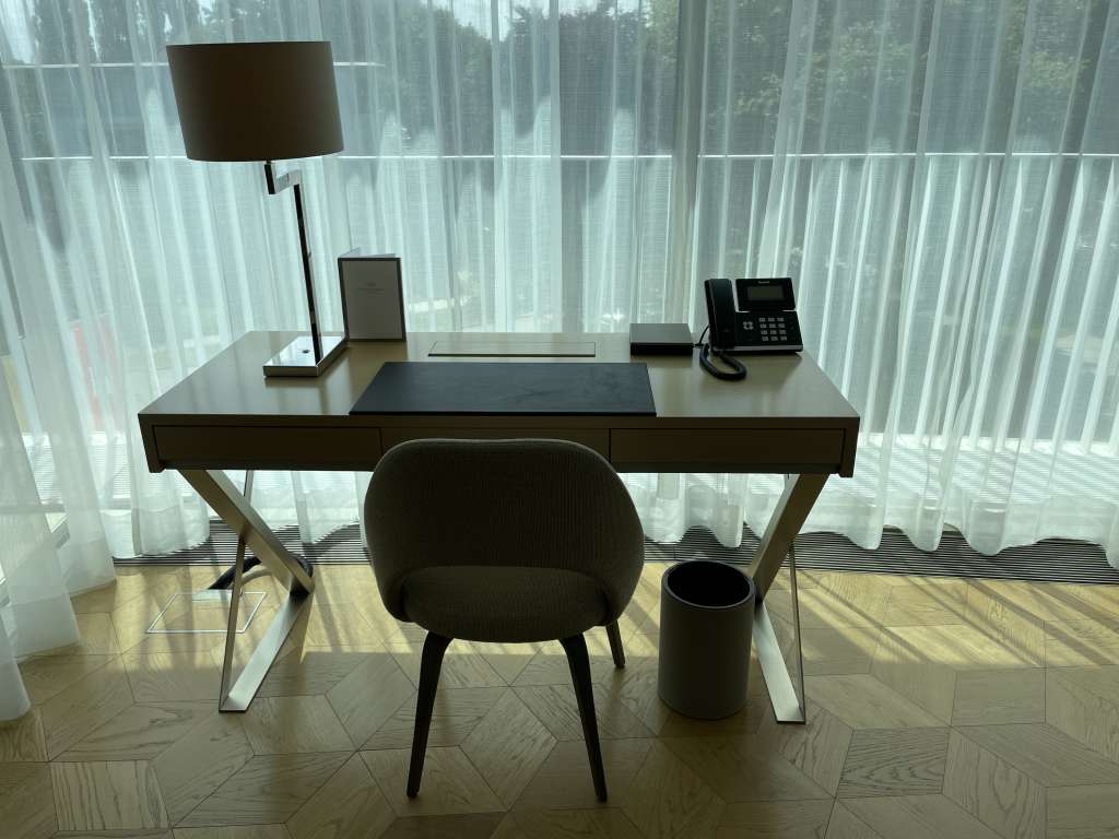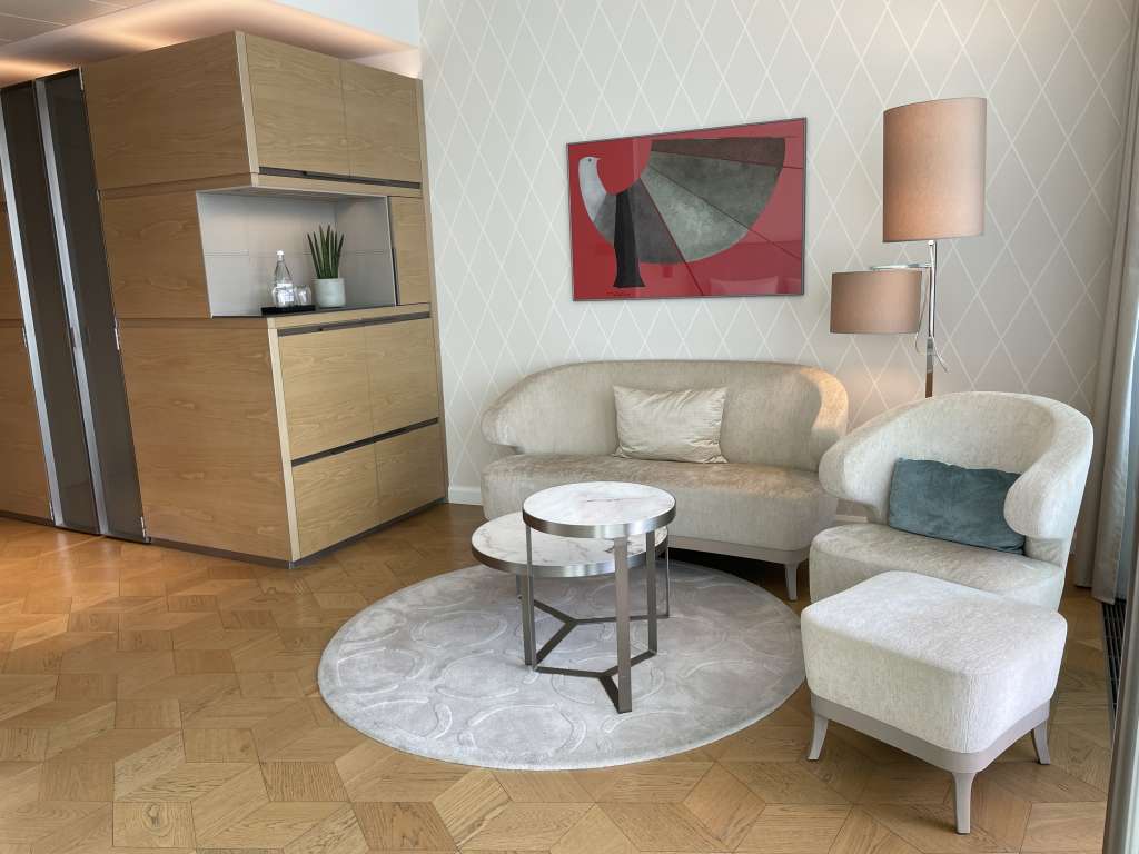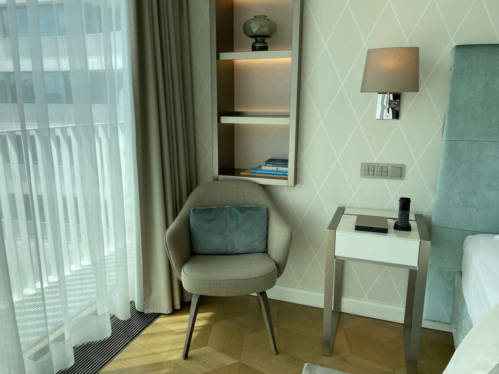Der komfortabler Sitzbereich lud zwar zum Entspannen ein, blieb von mir jedoch ungenutzt. Denn die meiste Zeit im Hotel verbrachte ich im Restaurant oder Spa-Bereich. Daran änderte auch ein gut durchdachter Arbeitsbereich mit einem modernen Schreibtisch und einem ergonomischen Stuhl nichts.