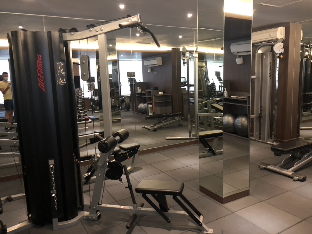 Auf der höchsten Etage ist ein Fitnessstudio, draußen befindet sich ein Pool und eine weitere Bar.