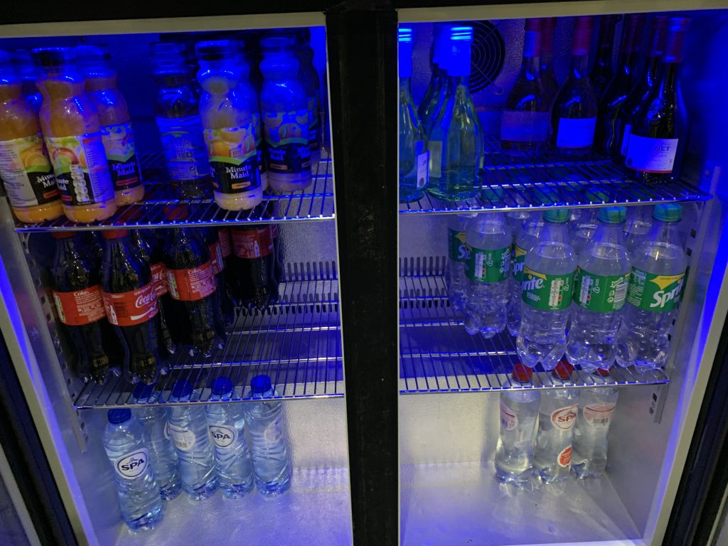 In einem Kühlschrank befanden sich außerdem Cola, Sprite und Wasser. An alkoholischen Getränken steht lediglich Wein in kleinen Flaschen zur Verfügung. Der JP Chenet ist allerdings als Weißwein so ungenießbar, dass wir zum Rose griffen. Zumindest so lang bis die drei Flaschen leer waren. Auch den Wein tranken wir mangels Alternative aus Pappbechern. Wobei meine bessere Hälfte klüger war, denn sie entdeckte die normalen Pappbecher für Kaffee, während ich meinen Wein aus der Espresso-Größe schlürfte.