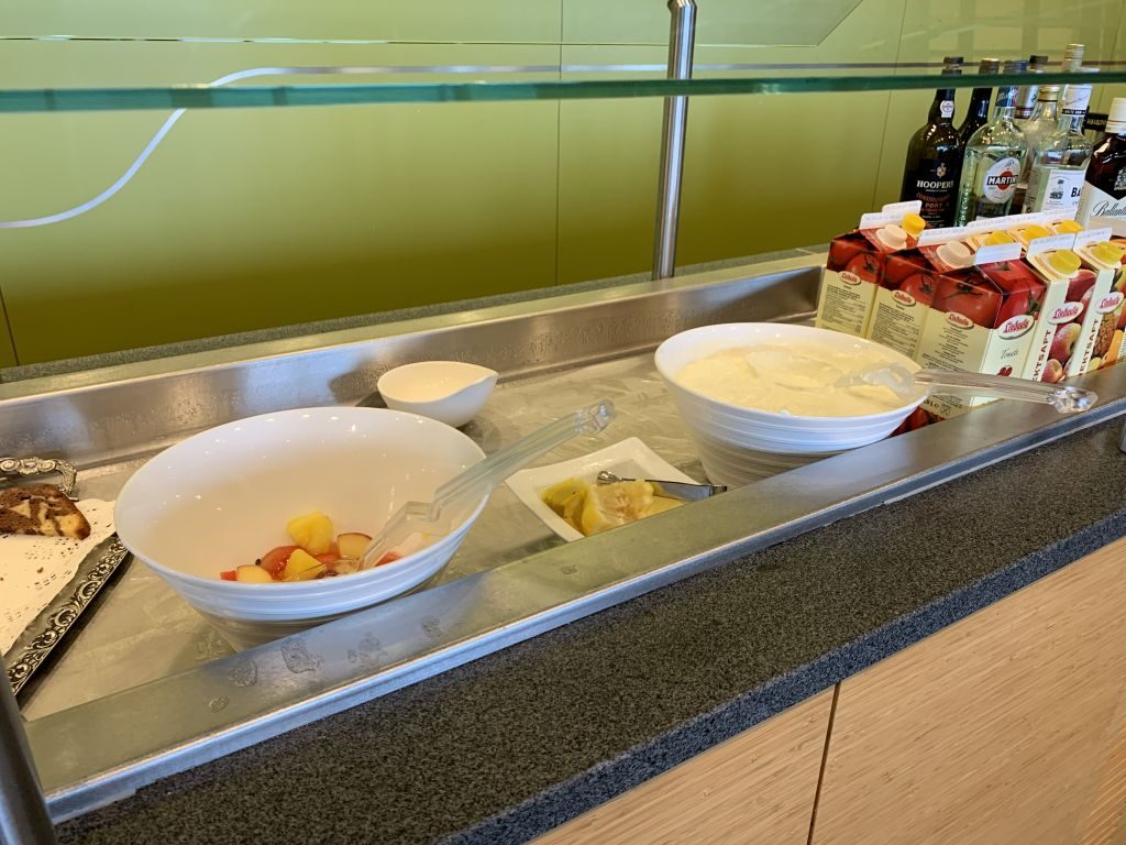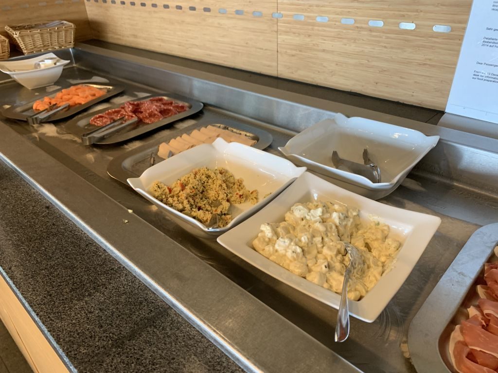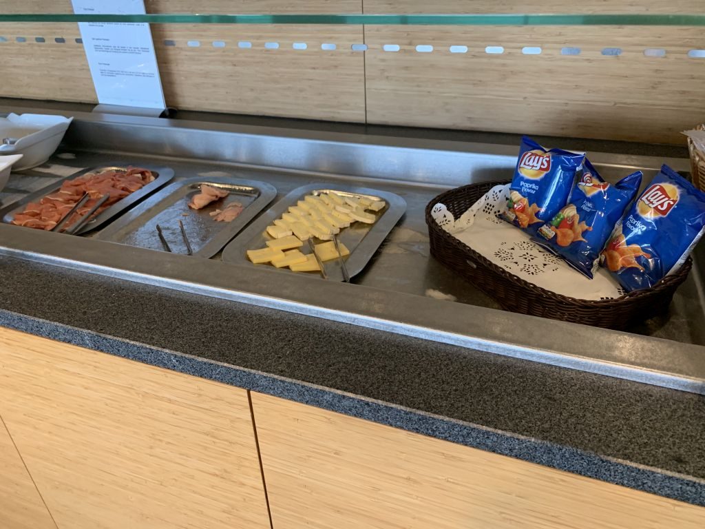 Direkt vorweg: The Lounge bietet keine wirkliche Abwechslung beim Essen an. Während der vier Stunden unseres Aufenthalts sah es durchgehend so aus, als wäre das Frühstück einfach stehen geblieben. Es gab Brötchen und dazu Wurst (Salami, Roastbeef und Schinken), Käse und Lachs. Auf dem Büffet daneben befand sich vorbereitetes Obst und Joghurt. Außerdem konnten wir uns an einem Körbchen mit Lays Chips bedienen. Warme Gerichte waren zu keiner Zeit vorhanden.