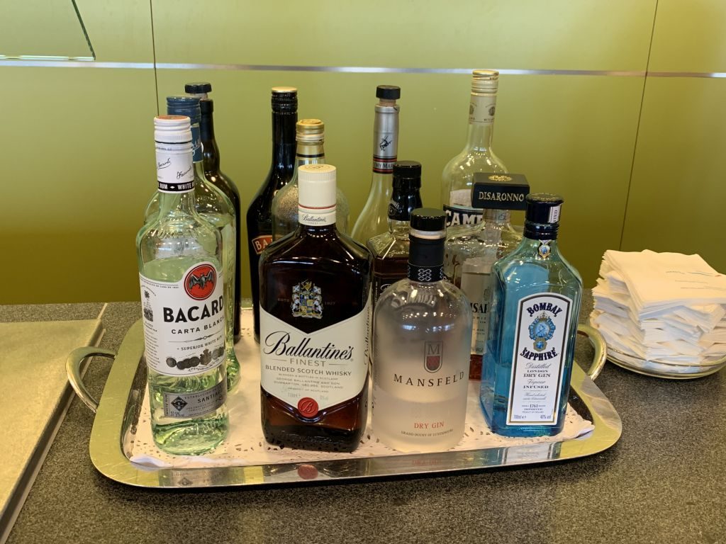 Die Auswahl der Spirituosen war schon umfangreicher als man es sonst von durchschnittlichen Lounges gewohnt ist. So gab es zum Beispiel mit Bombay Sapphire und Mansfeld zwei Sorten Gin zur Auswahl. Der Ballantines wurde mit der Zeit durch Jack Daniels ausgetauscht. Lediglich beim Wodka waren wir unschlüssig. In der Vitrine stand Absolut als Wodka-Marke und auf dem Büffet gab es einen 963-Wodka, von dem ich noch nie gehört und meine Finger gelassen habe. Mit Baileys und einem durchschnittlichen Portwein gab es auch etwas für nach dem Essen.