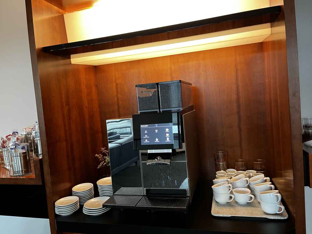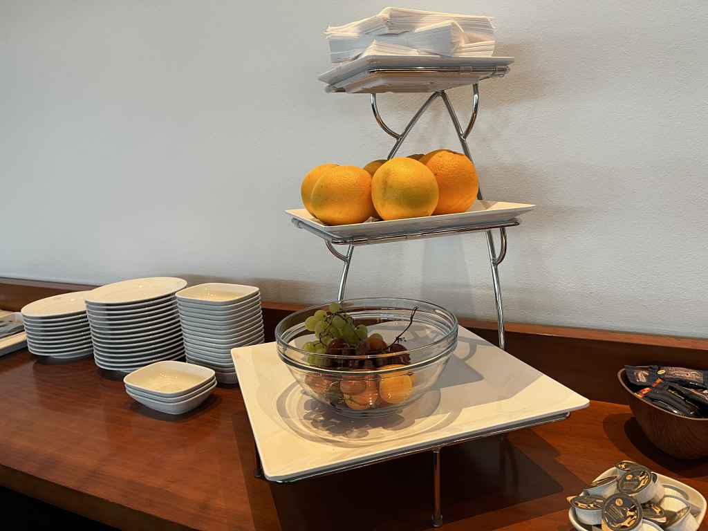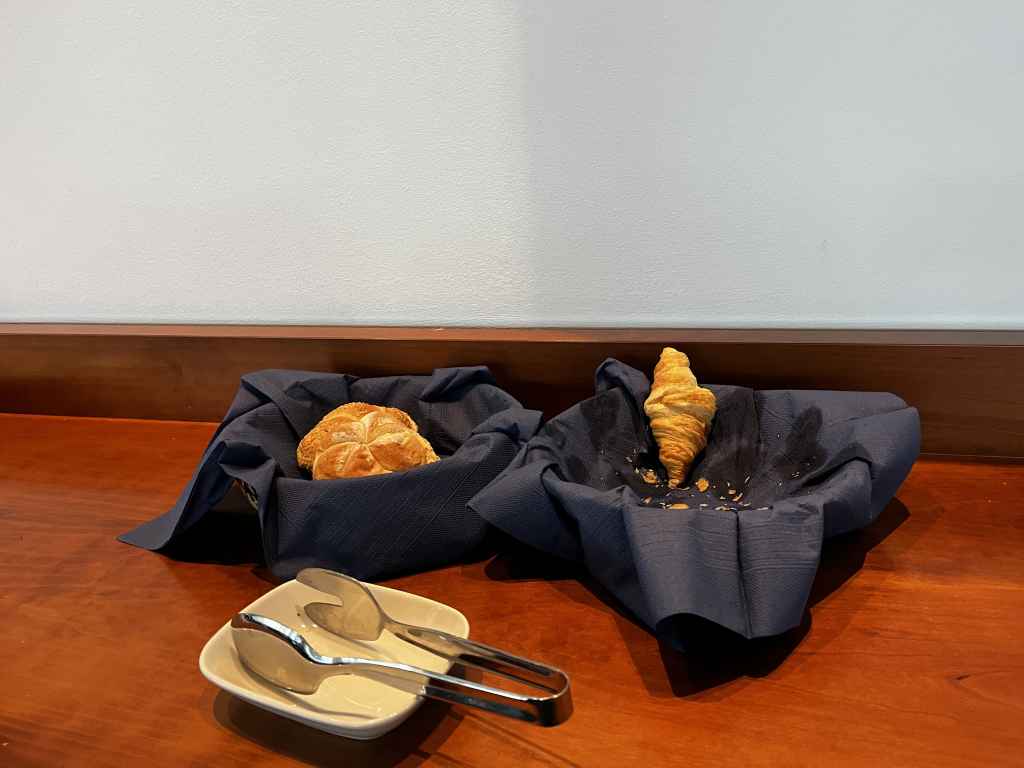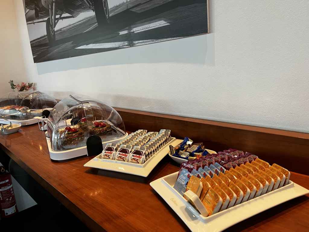 Während meines Besuchs hielten sich in der Lounge lediglich eine Hand voll Gäste auf und das erklärt vermutlich auch das begrenzte Angebot an Speisen. Neben Brötchen und Croissants gab es belegte Vollkorn-Brote und Spieße mit Tomate-Mozzarella. Als warme Option wurden zwischenzeitlich Mini-Pizzas, die verdächtig nach Dr. Oetker Piccola oder einem Alternativpodukt aussahen, serviert. Zu guter Letzt gab es noch salzige Snacks und Amarettini, die teilweise auch auf den Tischen standen.