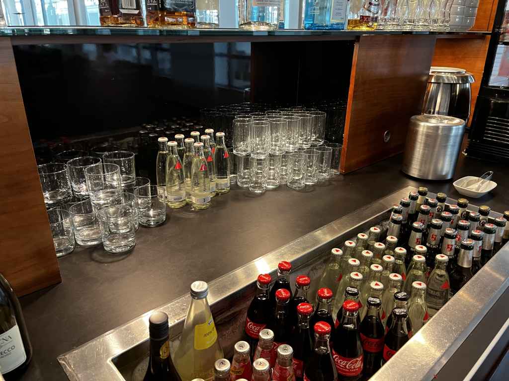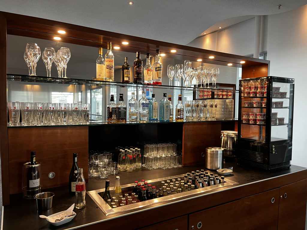 Getreu dem „The Lounge“-Konzept gibt es eine überschaubare Anzahl von Snacks und eine „gute“ Auswahl an alkoholfreien und alkoholischen Getränken. „Gut“ meint in dem Fall, dass sich die Spirituosen vom Niveau vieler unabhängiger Lounges in Deutschland abheben. So gib es statt des typischen Gordons Gin zwar keinen Hendricks mehr, dafür aber immer noch Bombay Sapphire. Statt Wodka Gorbatschow wird immerhin ein Absolut Wodka angeboten. Und so geht das Sortiment auch mit Rum, Whiskey und co. weiter.