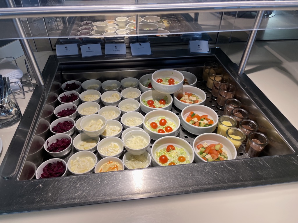 Die Auswahl an Speisen war überraschend gut und neben verschiedene Salaten und kleinen Desserts, gab es auch drei verschiedene warme Gerichte auf dem Buffet, ebenfalls in fertig vorportionierten Schalen, was mich ein wenig an Flugzeugessen erinnerte.