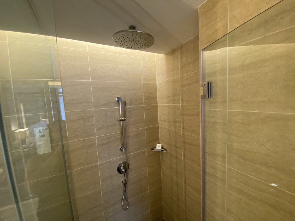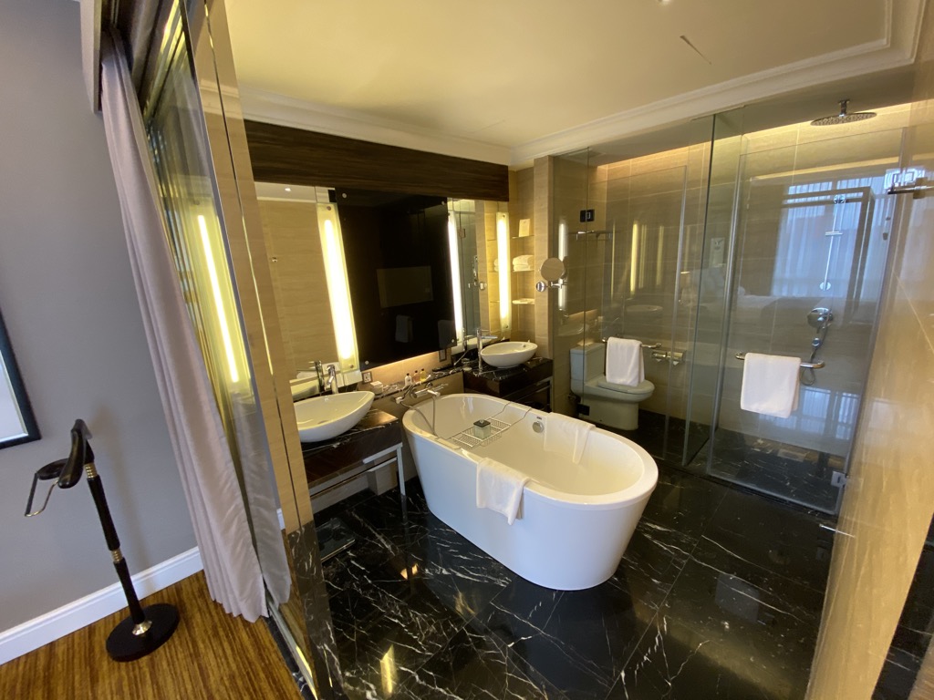 Ein wirkliches Highlight der Suite war definitiv das Badezimmer mit Doppelwaschbecken, freistehender Badewanne und Dusche mit Regenduschkopf. Positiv zu erwähnen ist, dass die Toilette mit einer Tür verschlossen werden konnte. Auch das gesamte Bad konnte mit einer Schiebetür und einem Vorhang vom restlichen Zimmer abgeschirmt werden. Hier begrüßte uns natürlich eine vollständige Auswahl Amenities.