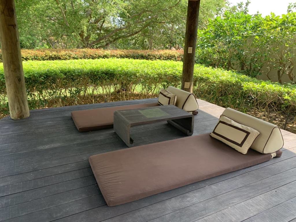 Um den Pool herum gibt es zwei Liegen, eine überdachte Couch und einen Pavillon mit Matratzen auf dem Boden. Während wir auf den Liegen zumindest gelegentlich etwas Sonne einfangen konnten, eignete sich der riesige Pavillon gut, um abends noch gemütlich etwas Zeit im freien zu verbringen. Der kleine Beistelltisch diente gleichzeitig auch als Schachbrett, für das die Figuren im inneren der Villa lagen.