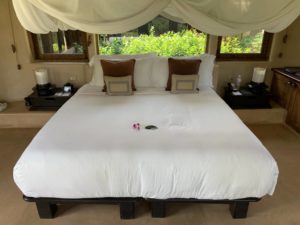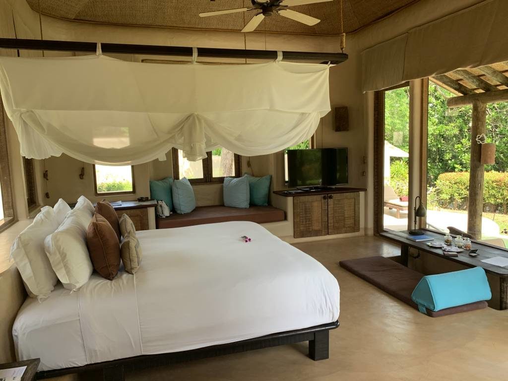 Auch der Turn-Down-Service hat diesbezüglich gut geklappt. Und hier war der Turn-Down-Service auch wirklich sinnvoll. Es wurde nicht nur das Bett aufbereitet, sondern auch das Moskito-Netz um das Bett gehängt und einige Teelichter aufgestellt. Direkt nach der ersten Nacht hat das House-Keeping erkannt, dass wir abends gerne noch etwas unter dem Pavillon liegen und ihn daher täglich mit neuen Handtüchern ausgestattet. Nur eines der vielen kleinen Details.