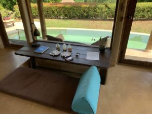 Unsere Tropical Pool Villa war komplett durch Wände oder Hecken umzäunt, so dass wir hier ein hohes Maß an Privatsphäre hatten. An der Eingangstür zur privaten Anlage befand sich eine Tür-Klingel und ein „Do not disturb“-Stein (ja „Stein“, nicht „sign“). Ein kleiner sandiger Fußweg führt dann sowohl zur Villa als auch zum eigenen Garten.