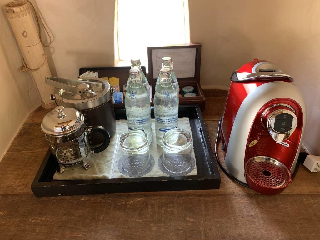 Kaffee und Tee sind kostenlos und können mit dem ebenfalls bereitstehenden Trinkwasser zubereitet werden. Extrem positiv: Gästen stehen insgesamt sechs große Flaschen Wasser gratis zur Verfügung, die täglich aufgefüllt werden. Zeitweise hatten wir zehn große Flaschen Wasser auf dem Zimmer (plus angebrochene).