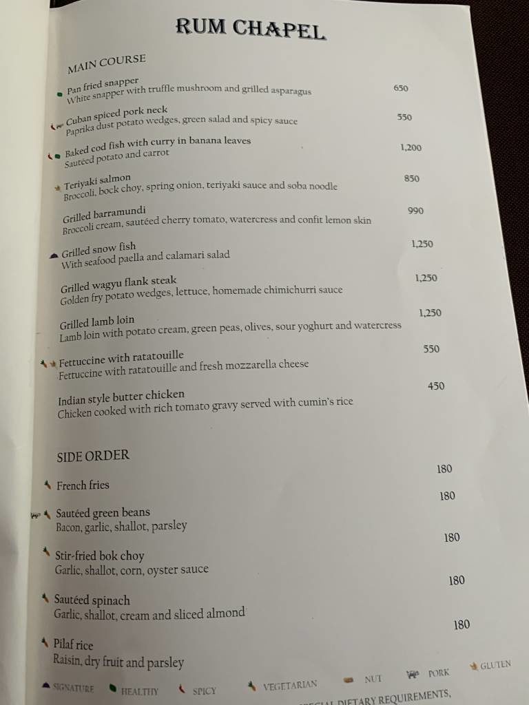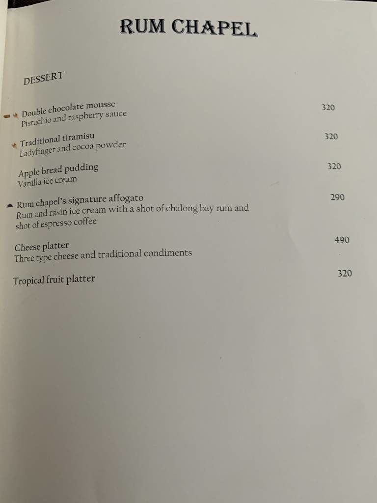 Das neuste Restaurant ist die „Rum Chapel“, welche tagsüber auch das Essen am Pool und am Strand serviert. Abends stehen westliche Speisen mit lokalem Einschlag auf der Speisekarte.