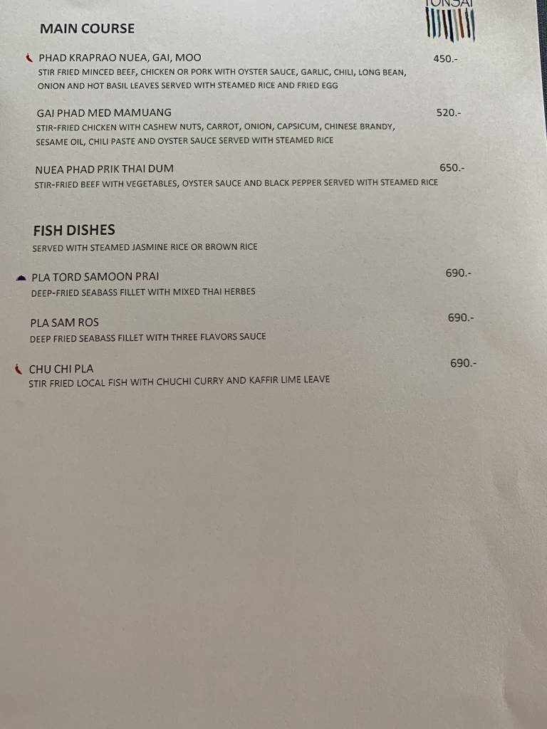 Die umfangreiche Auswahl an a la Carte Speisen wird durch ein noch umfangreicheres Büffet ergänzt. So gibt es eine Auswahl warmer asiatischer Gerichte, Brot, Gebäck und vieles Weiteres. In einem separaten gekühlten Raum gibt es eine hochwertige Auswahl an Wurst und Käse. Dazu Joghurt, Milch und Smoothies. Auch Salat und täglich wechselndes Sushi gehören zum Angebot.