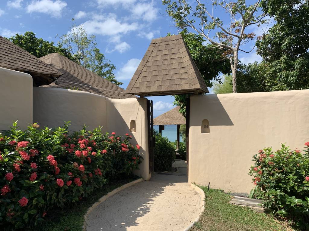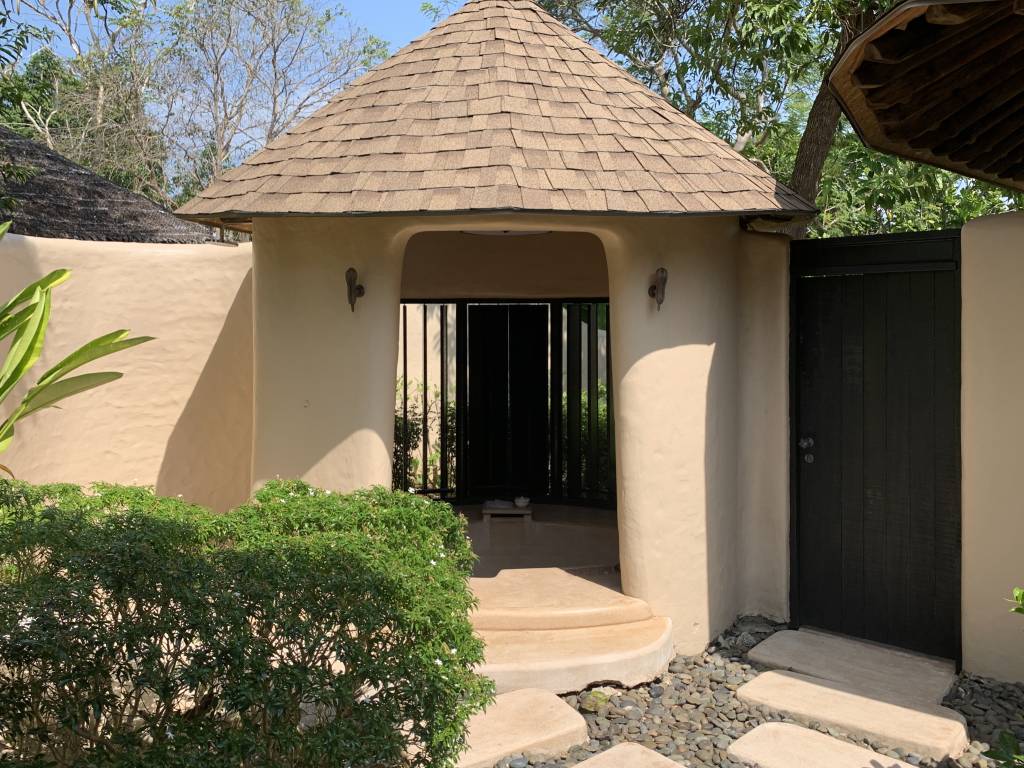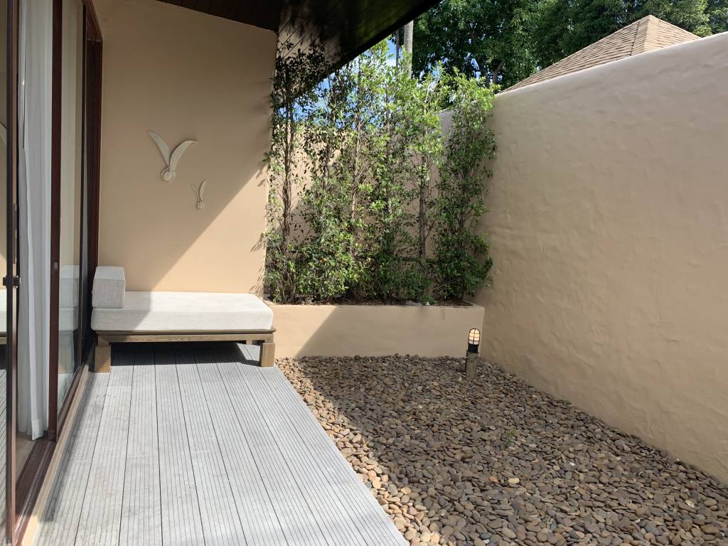 Unsere Tropical Pool Villa war komplett durch Wände oder Hecken umzäunt, so dass wir hier ein hohes Maß an Privatsphäre hatten. An der Eingangstür zur privaten Anlage befand sich eine Tür-Klingel und ein „Do not disturb“-Stein (ja „Stein“, nicht „sign“). Ein kleiner sandiger Fußweg führt dann sowohl zur Villa als auch zum eigenen Garten.