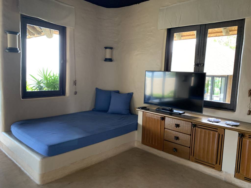 Der erste Raum der Villa ist der Wohn- und Schlafbereich. Den größten Teil der Fläche nimmt dabei das riesige und unglaublich bequeme Kingsize-Bett ein. Direkt gegenüber dem Bett ist ein Schreibtisch in den Boden eingelassen, von dem man perfekt auf den eigenen Pool schauen kann. An einer weiteren Wand gibt es noch eine kleine Couch. Auf der einen Seite daneben steht der große Flachbildfernseher und auf der anderen Seite eine Kommode, in der sich der Safe verbirgt.