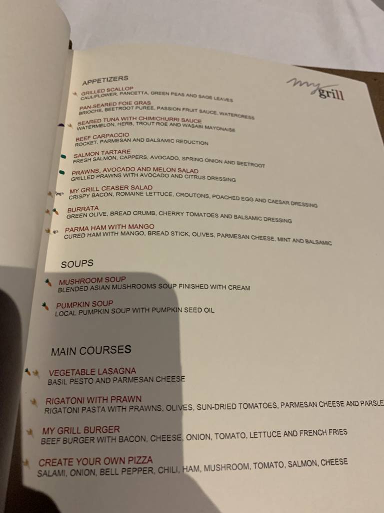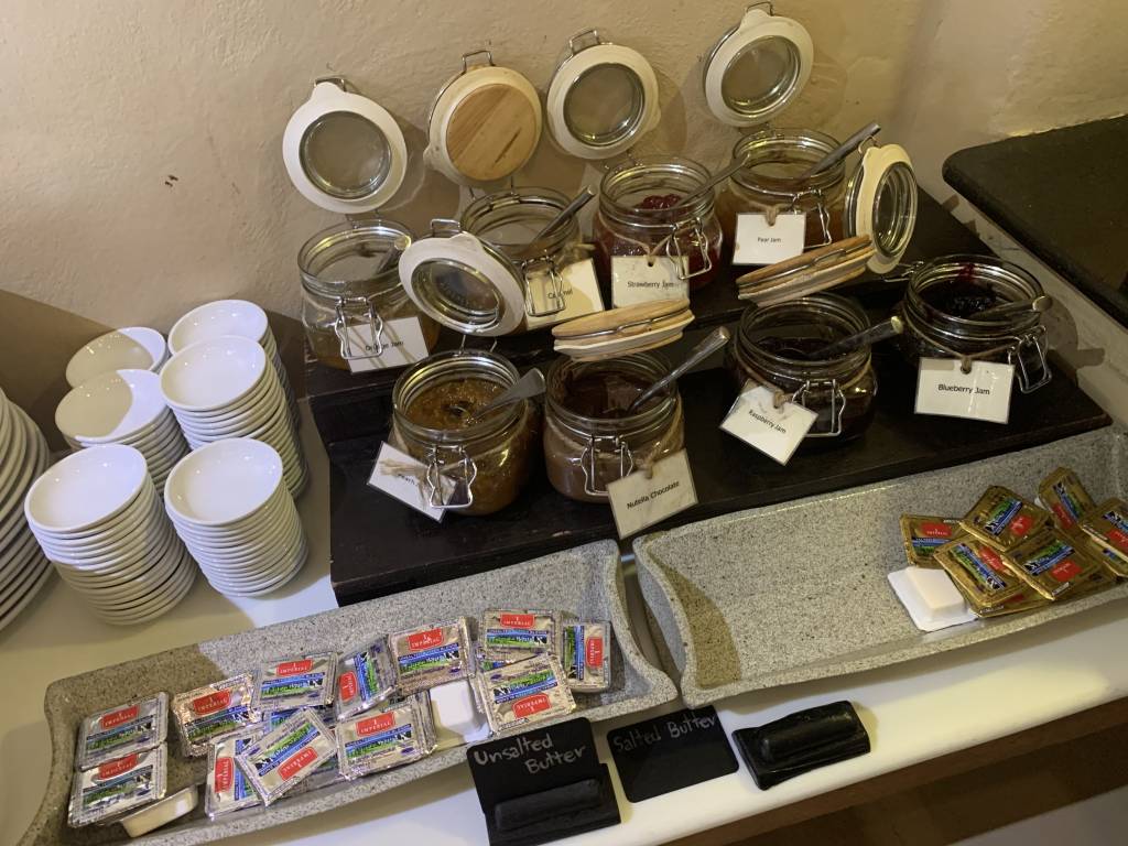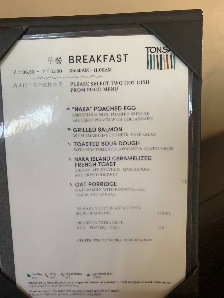 Auf den Tischen stehen während der Frühstückszeiten von 6:30 bis 11:00 Uhr Kärtchen mit „made to order“-Optionen. Diese gehen deutlich über die üblichen Eier-Speisen hinaus. So könnt Ihr Euch zum Beispiel zunächst eine Portion gegrillten Lachs und danach noch eine Portion Steak und ein Naka Island style french toast mit Schokolade, Kokos und Mascarpone bestellen.