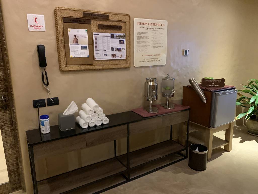 Wem es in der Sonne zu heiß ist, der kann sich in dem zweistöckigen Fitness-Center auspowern. Das Gym ist bestens ausgestattet und bietet sowohl Geräte zum Krafttraining, als auch diverse Kardio-Geräte. Das hohe Niveau des Resorts zeigt sich auch hier in den Details: Neben normalen Handtüchern gibt es auch gekühlte Handtücher. Außerdem können Fitness-Fans zwischendurch zu einem Apfel greifen und sich mit Wasser erfrischen.