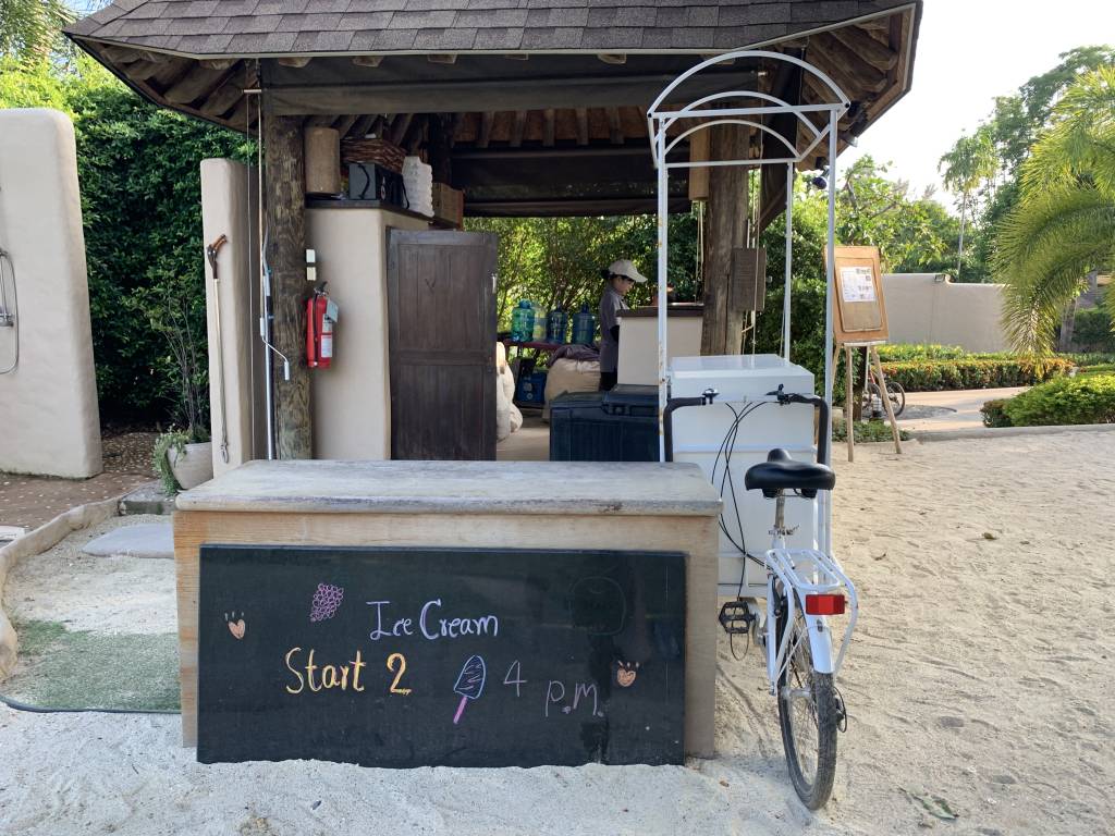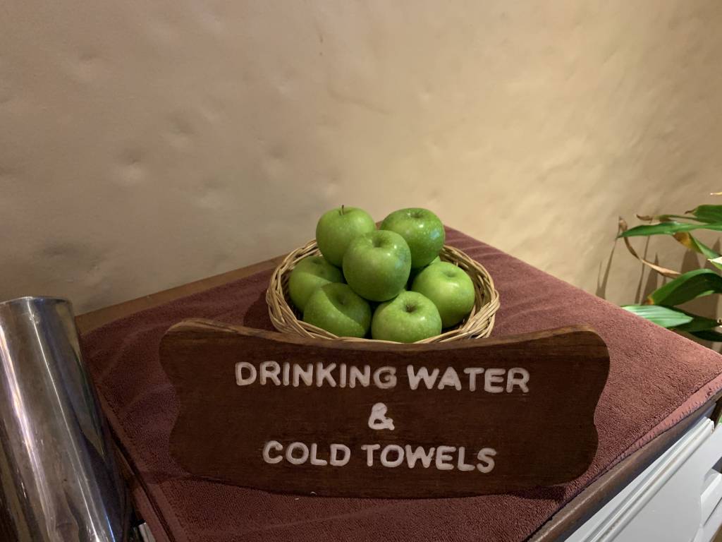 Nach der kurzen etwa fünfminütigen Bootsüberfahrt wurden wir zunächst mit einem weiteren Golfbuggy zu einem „Gong“ gefahren. Dort steht die Willkommenszeremonie an, bei der jeder Gast zwei Mal gegen einen Gong schlägt. Danach gibt es ein kleines alkoholfreies Begrüßungsgetränk in einem Shot-Glas.