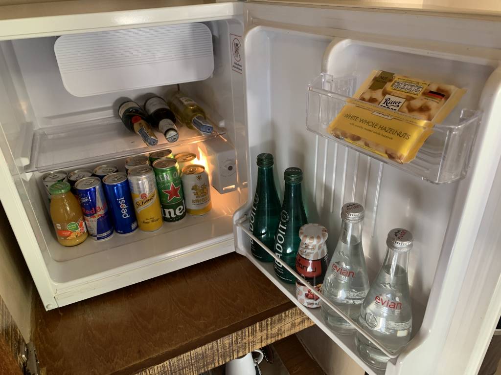 Die Minibar ist mit diversen Softdrinks und Bieren bestückt. Darunter war sogar ein deutsches Bier. Wer es exklusiver mag, kann auch auf ein Fläschchen Moët zugreifen. Spirituosen und Rotwein gibt es ebenfalls. Diese liegen in einer Schublade neben der Minibar.