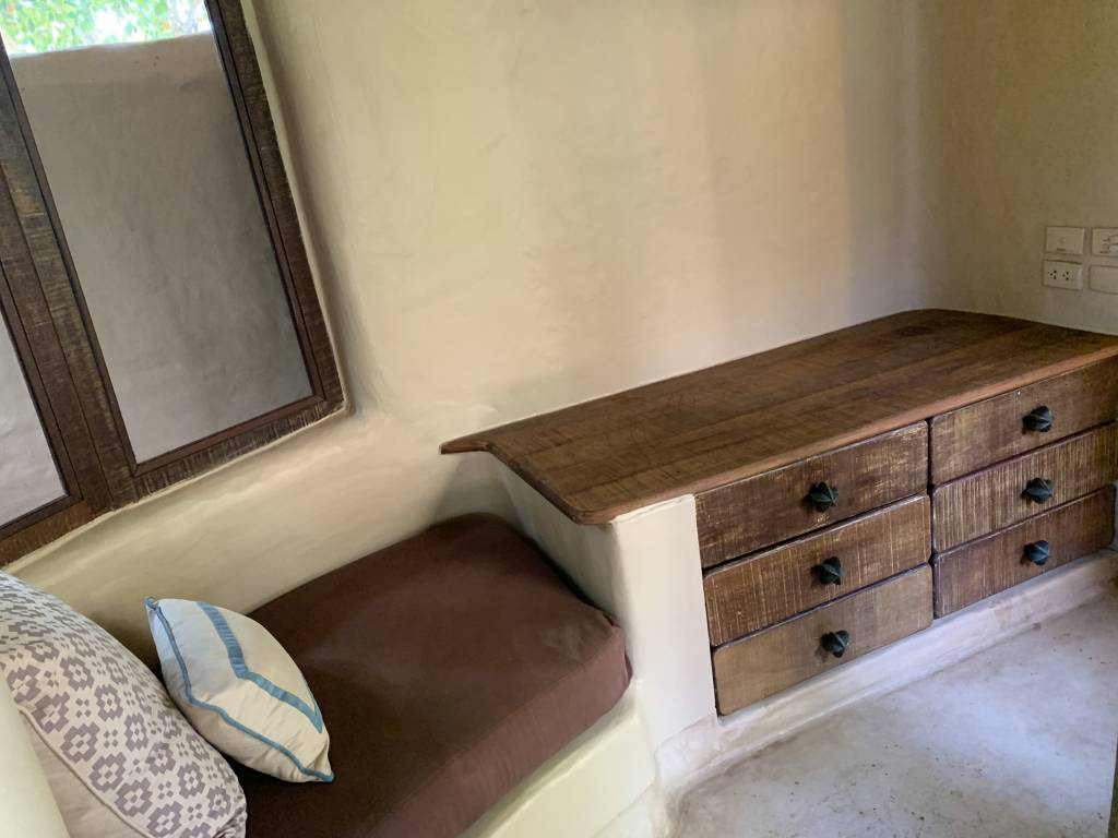 Um den Pool herum gibt es zwei Liegen, eine überdachte Couch und einen Pavillon mit Matratzen auf dem Boden. Während wir auf den Liegen zumindest gelegentlich etwas Sonne einfangen konnten, eignete sich der riesige Pavillon gut, um abends noch gemütlich etwas Zeit im freien zu verbringen. Der kleine Beistelltisch diente gleichzeitig auch als Schachbrett, für das die Figuren im inneren der Villa lagen.